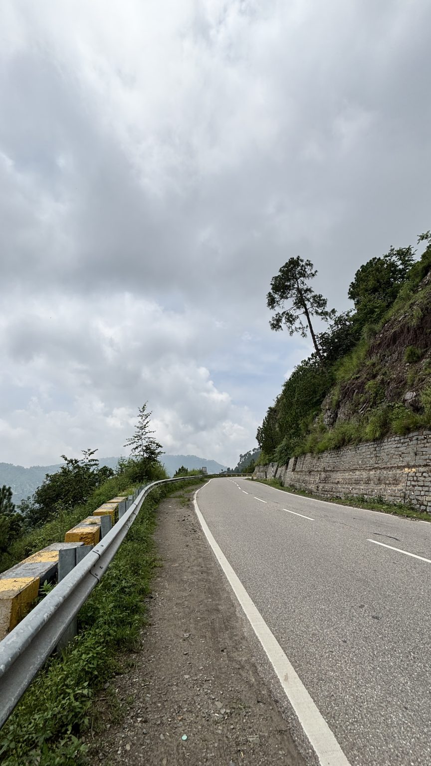 Alternative Text: A winding road with yellow-black guardrails curves through the hills of Himanchal.