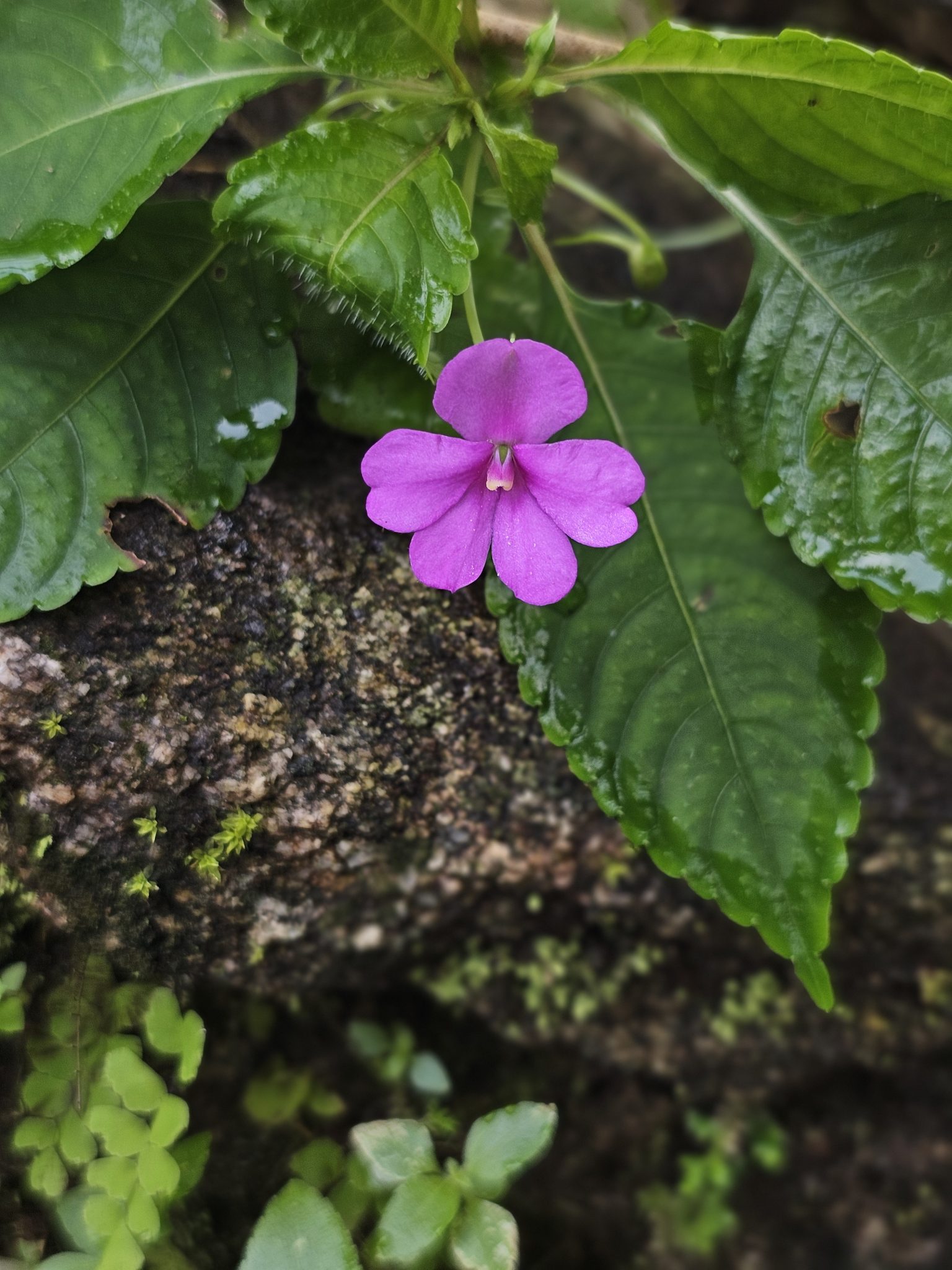 Alternative Text: A bright pink wildflower blooming on a mossy rock with fresh green leaves around it, after a light rain. Captured near Thrikkariyoor, Malappuram.