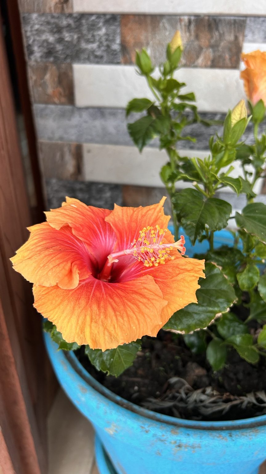 Alternative Text: A vibrant hibiscus flower with orange and pink hues is in full bloom, set against a backdrop of a textured wall with light and dark stone patterns.