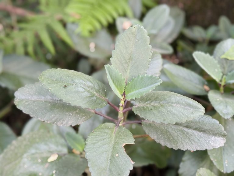Alternative Text: A close-up of a green plant with broad serrated leaves and a reddish stem, set against fern leaves.