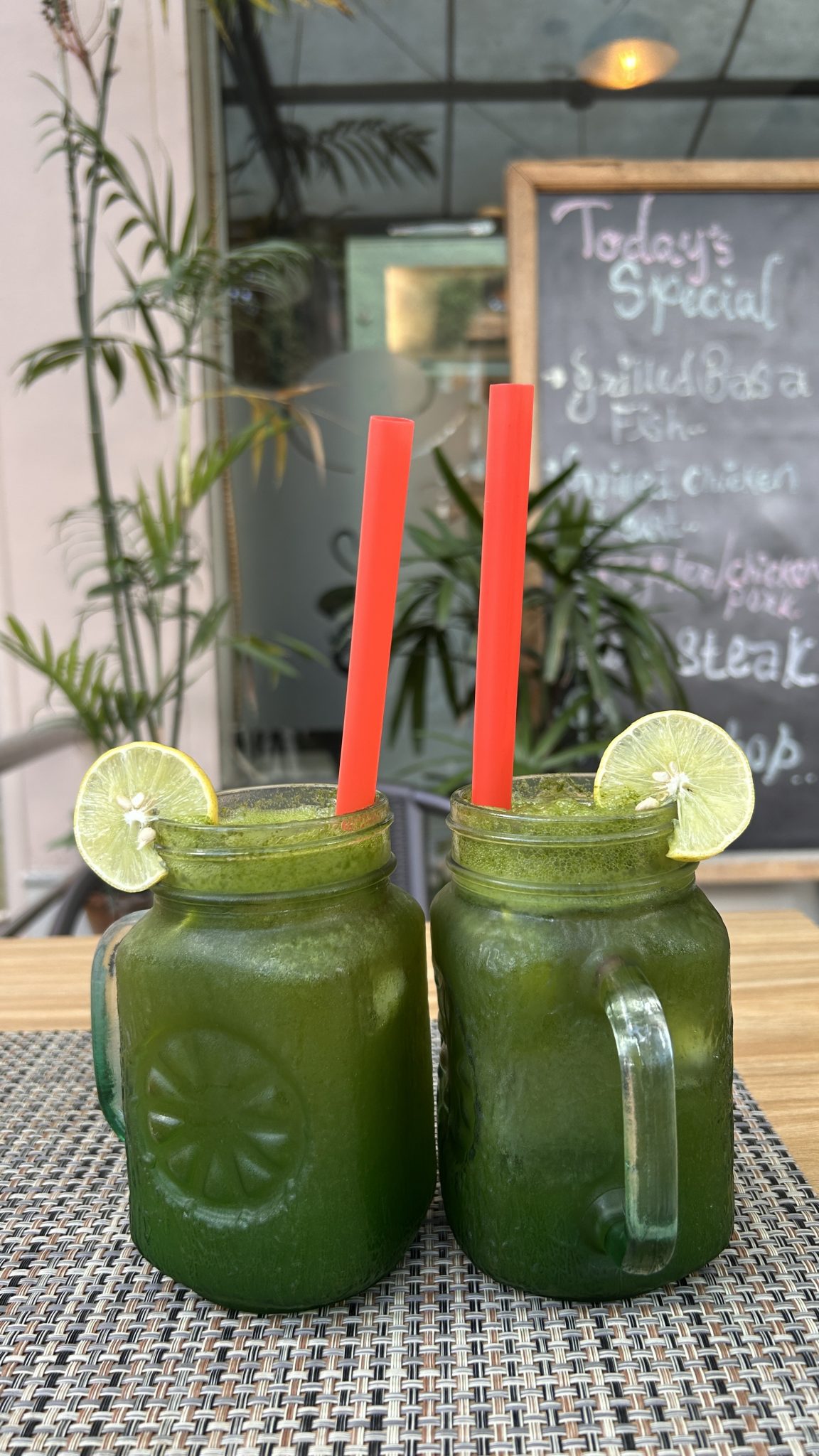 Alternative Text: Two mason jar glasses filled with a green beverage, each adorned with a slice of lime.The background features greenery and a chalkboard displaying the day’s specials.