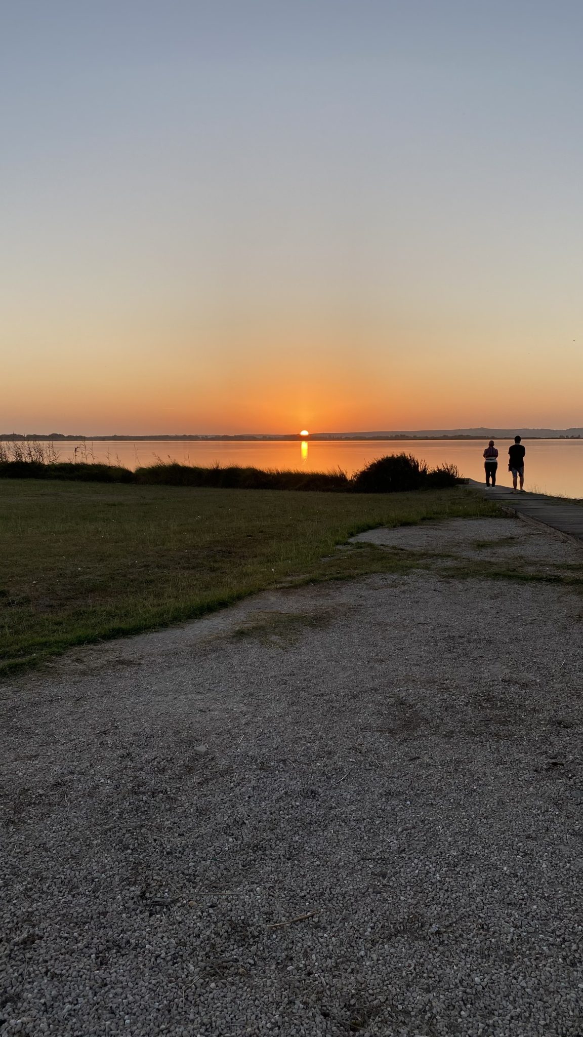 Alternative Text: A serene scene of a sunset over a calm body of water. The sun is low on the horizon, casting a golden-orange glow across the sky and reflecting on the water’s surface. In the foreground, a gravel path leads to a grassy area with sparse vegetation. On the right side of the image, two people stand at the water’s edge, silhouetted against the sunset. The sky transitions from the warm hues near the horizon to a clear, pale blue higher up, indicating a clear and tranquil evening. The overall atmosphere is peaceful and contemplative.