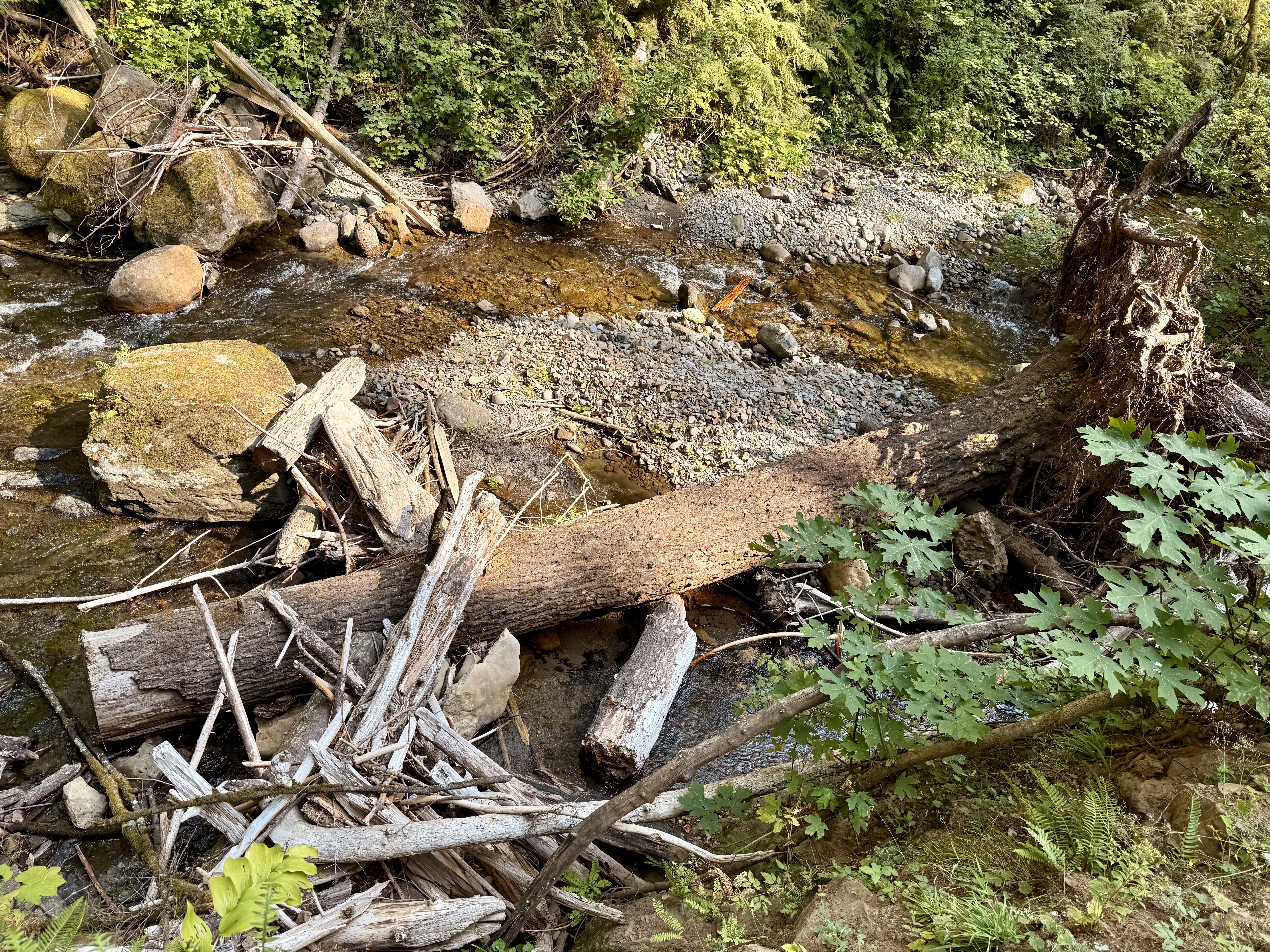 Alternative Text: Fallen logs and scattered driftwood lie across a shallow stream surrounded by rocks and greenery. Columbia River Gorge National Scenic Area, Oregon.