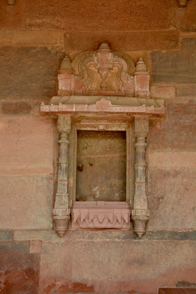 Alternative Text: An ornate red sandstone niche with intricate carvings, showcasing Mughal architectural detail. Captured at Fatehpur Sikri, Uttar Pradesh.