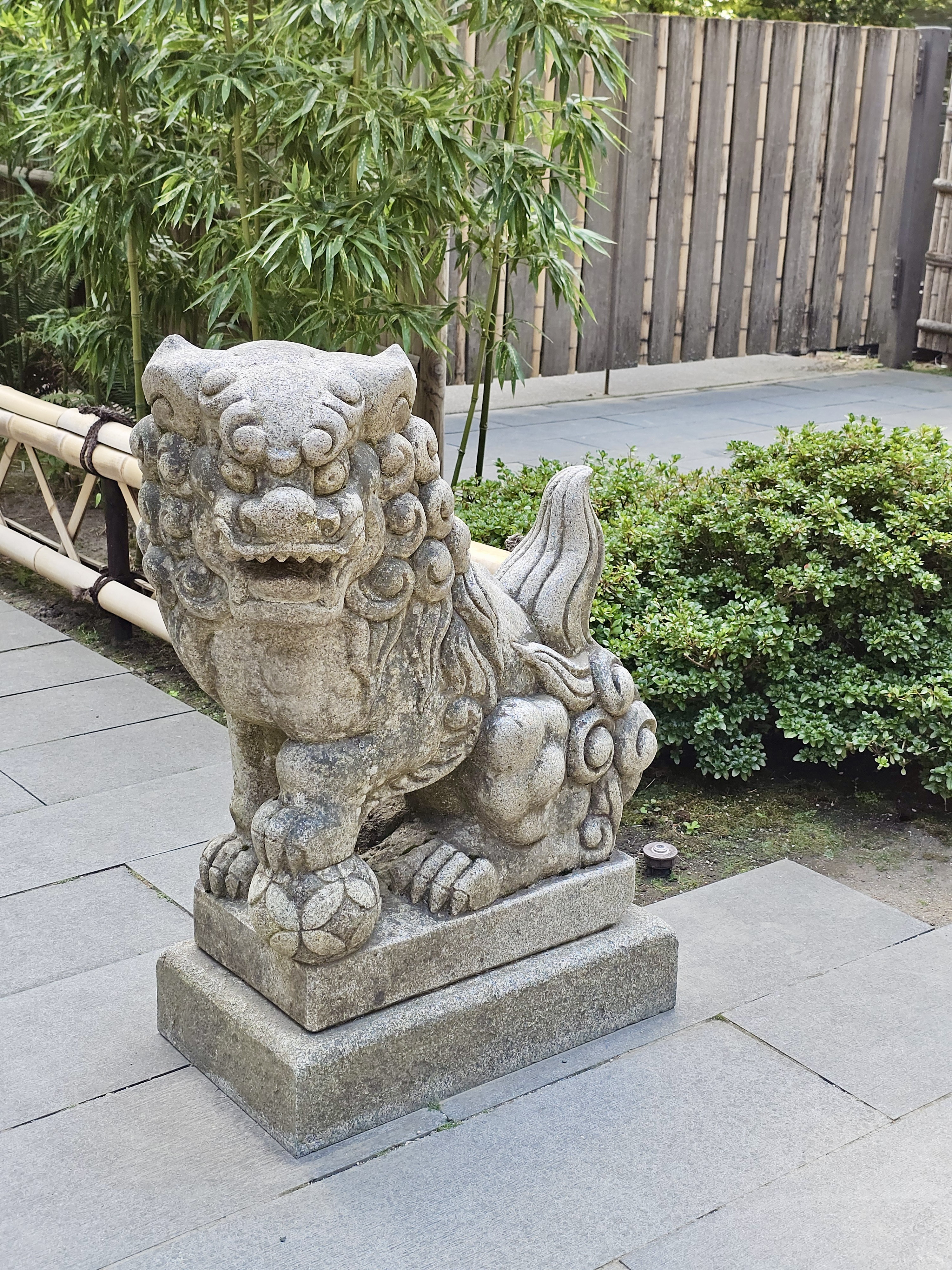 Alternative Text: A stone statue of a traditional Japanese lion (shishi) standing guard near bamboo and shrubs. Captured in Portland Japanese Garden.