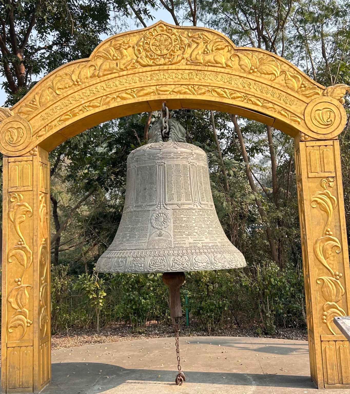 Alternative Text: A large, ornate bell hangs from a golden-yellow arch adorned with intricate carvings and floral motifs.