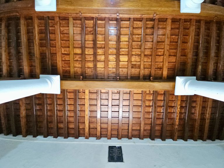 Alternative Text: Polished wooden ceiling with white columns inside St. Francis Church in Fort Kochi, Kochi. A showcase of traditional Kerala craftsmanship and colonial elegance.