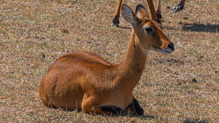 Alternative Text: A reddish-brown Uganda kob stands alert in tall yellow grass with scattered acacia trees.