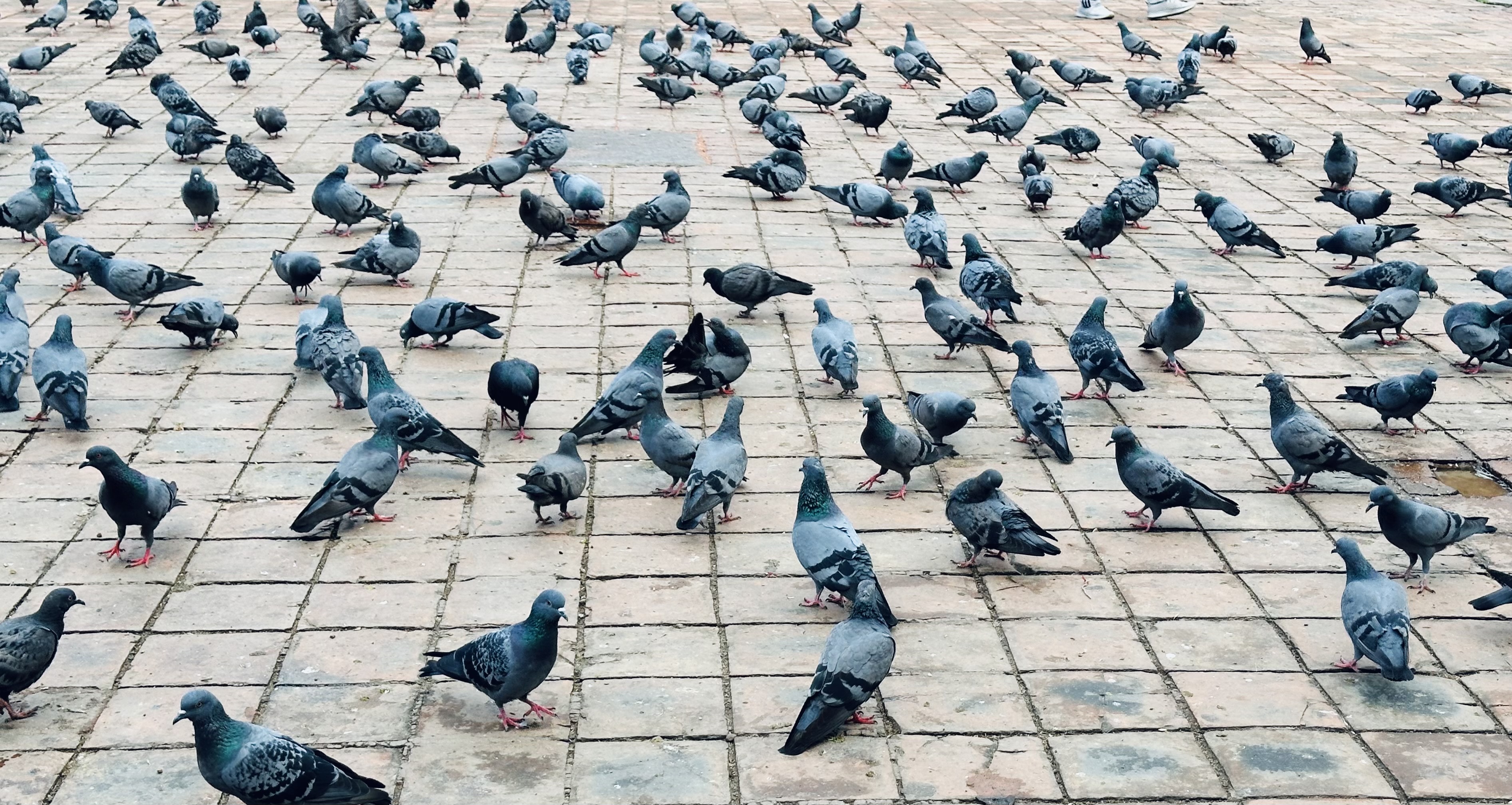 Alternative Text: A large group of pigeons is gathered on a patterned stone surface.
