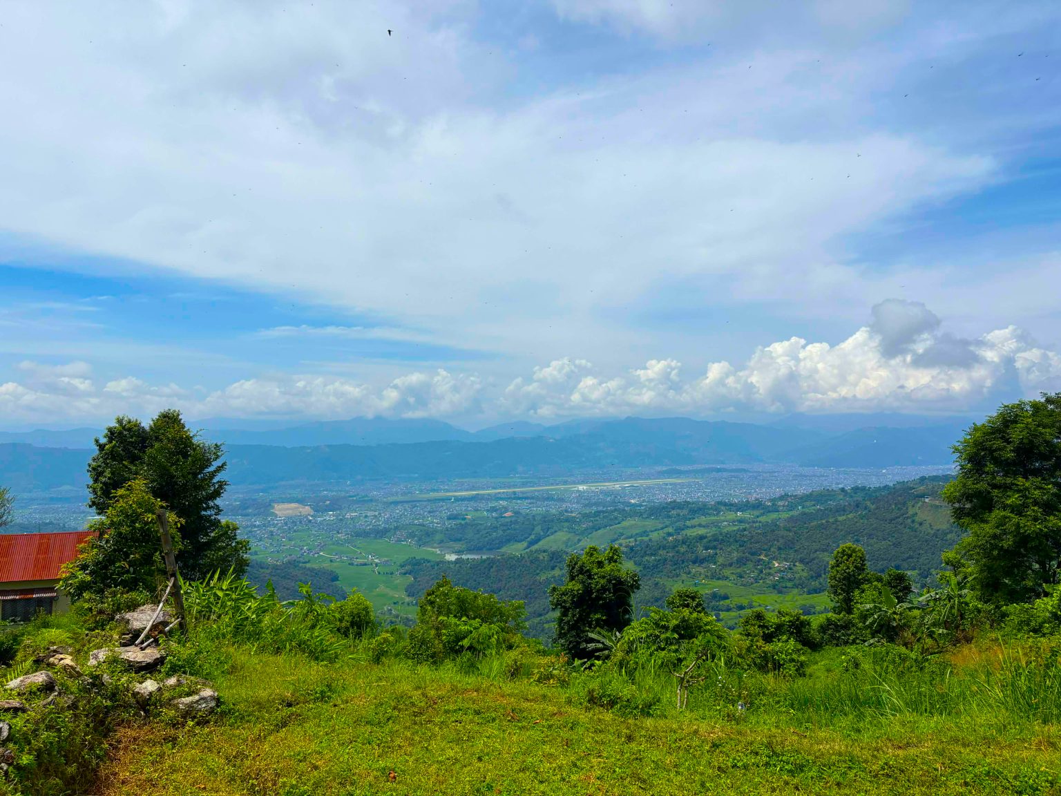 Alternative Text: A panoramic view of a lush green landscape with rolling hills and valleys under a partly cloudy sky