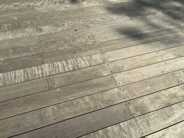 Alternative Text: A close-up view of a wooden deck, featuring long, evenly spaced planks secured with small metal screws. The wood shows natural grain patterns and subtle weathering, giving it a rustic, sun-washed look. Soft shadows fall across the boards, adding depth and texture to the simple, minimalistic scene.