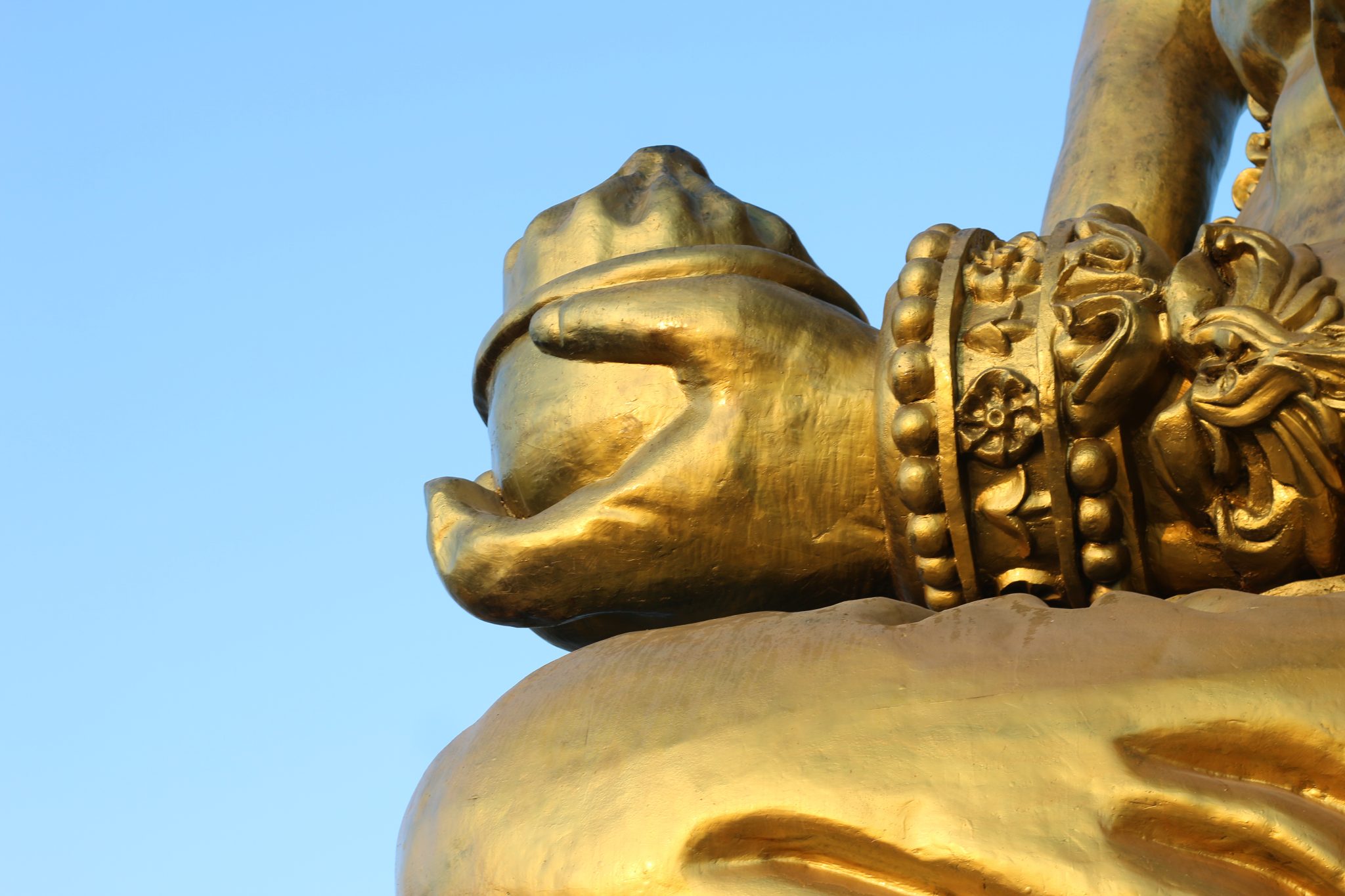 Alternative Text: A close-up of a golden statue’s hand, which holds a small bowl or pot.
