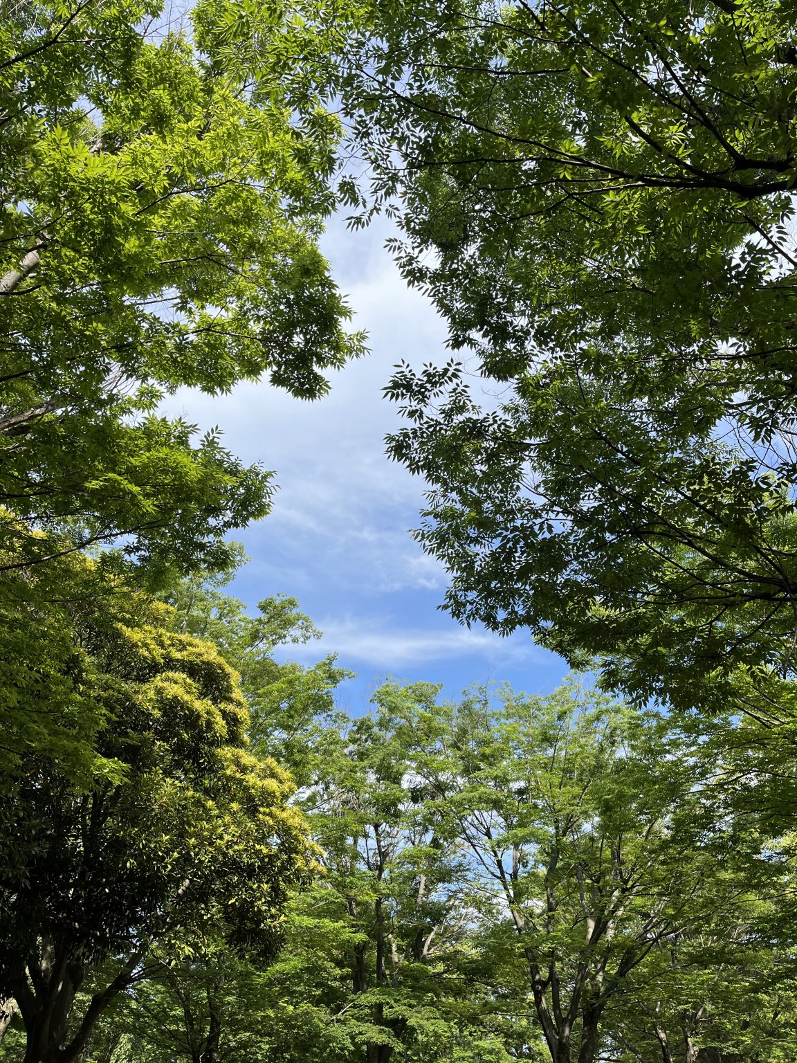 Alternative Text: A view looking up at a canopy of green trees with a bright blue sky and some white clouds visible through the gaps in the leaves.