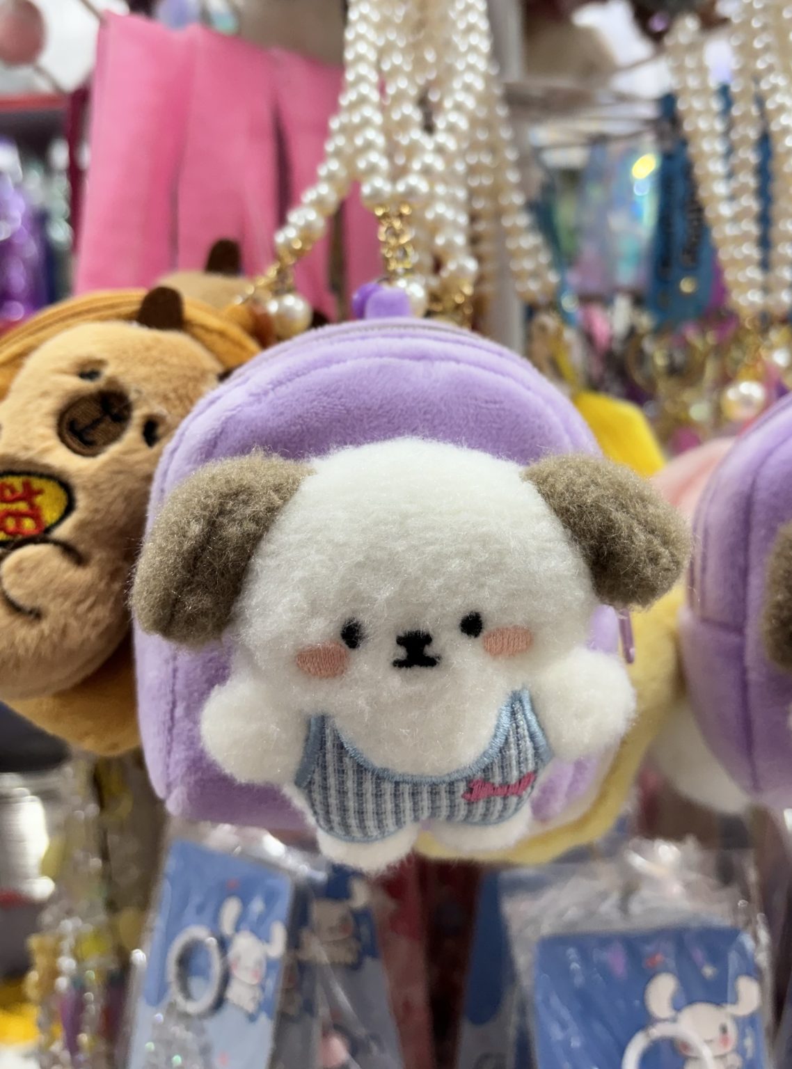 Alternative Text: A stuffed animal is playfully hanging from the strap of a purse, adding a whimsical touch to the accessory
