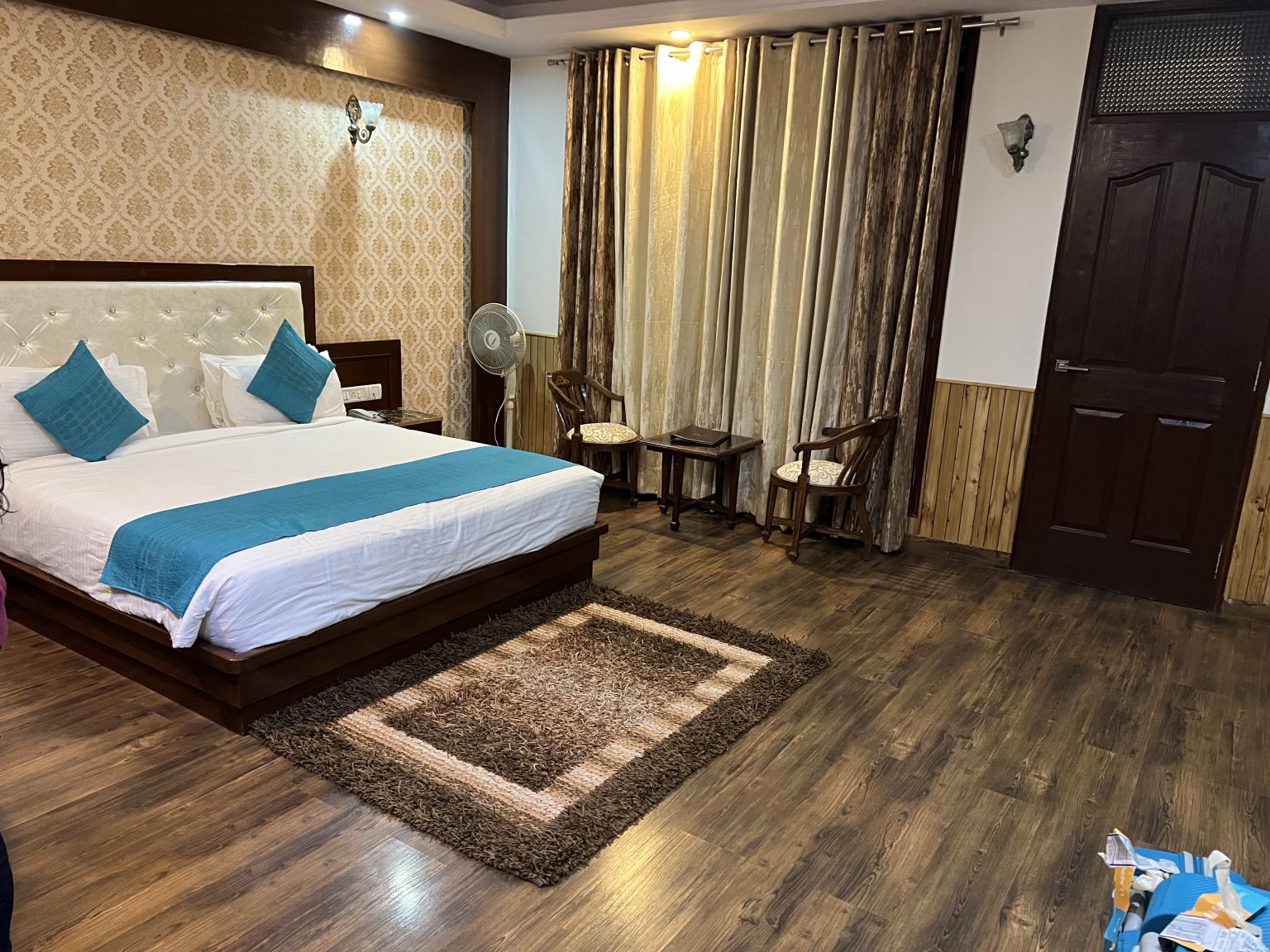 Alternative Text: A cozy hotel room featuring a queen-sized bed with a light-colored headboard and two teal cushions.