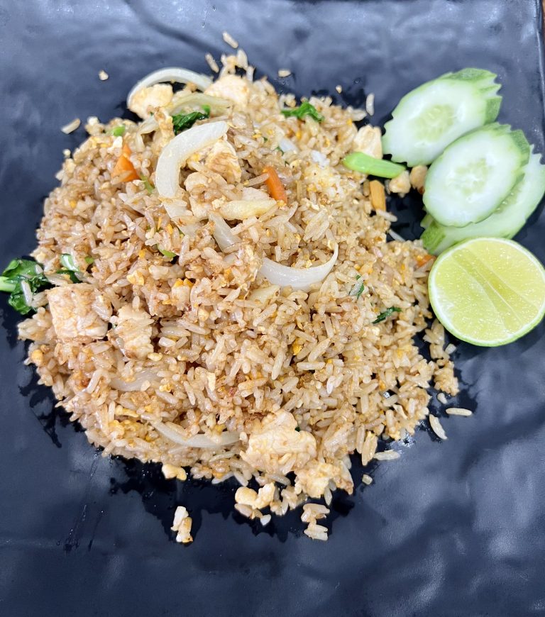Alternative Text: A plate of chicken fried rice with sliced onions, carrots, and a side of cucumber slices and a lime wedge.