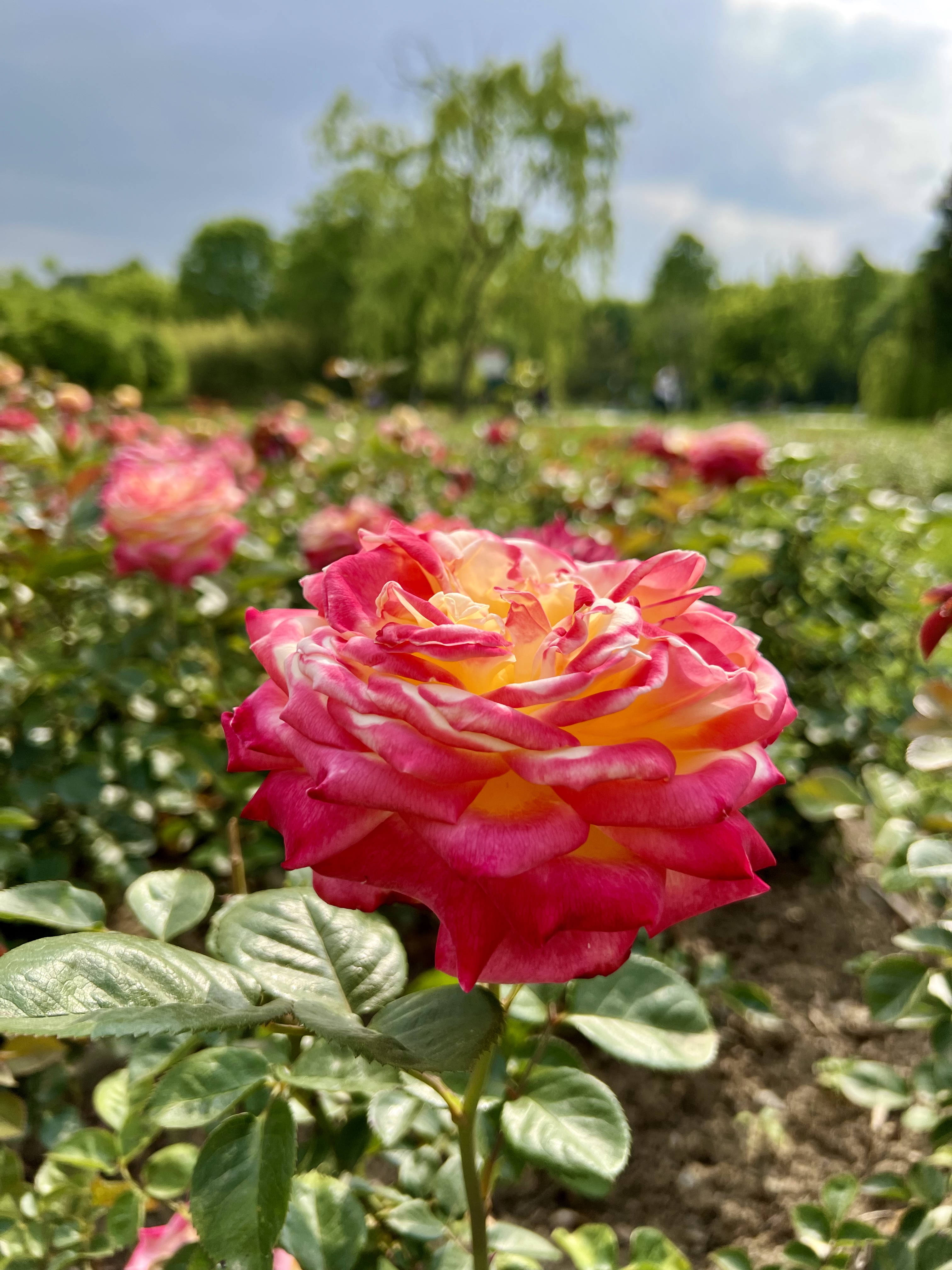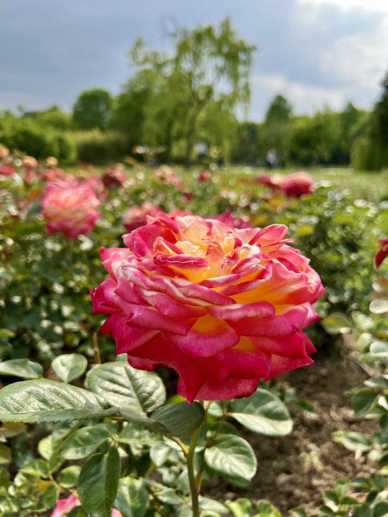 Alternative Text: A vibrant pink and yellow rose stands in the foreground, surrounded by a lush garden of roses.