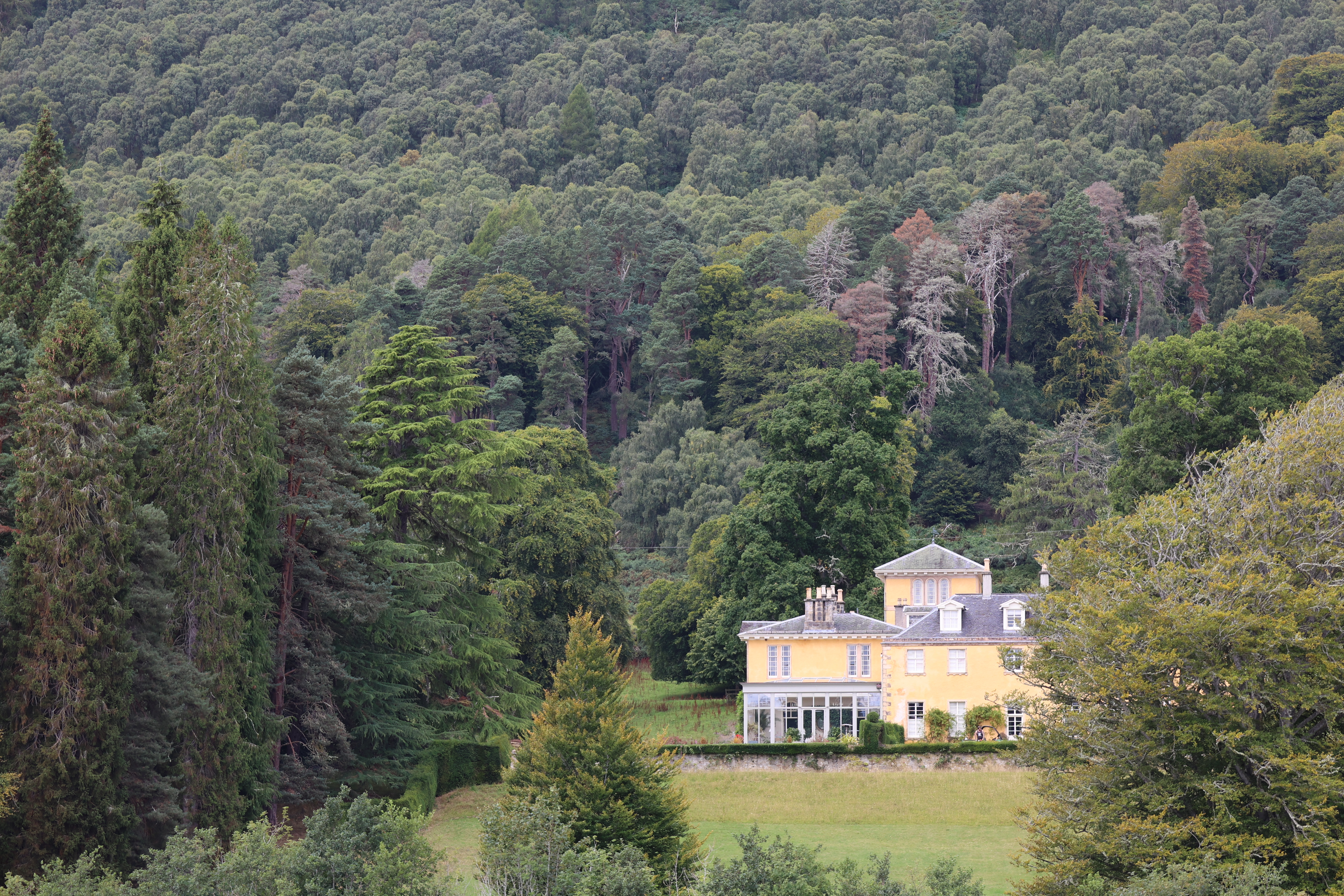 Alternative Text: Dochfour Estate House, painted a soft primrose yellow with classic Georgian windows, is surrounded by a variety of trees.