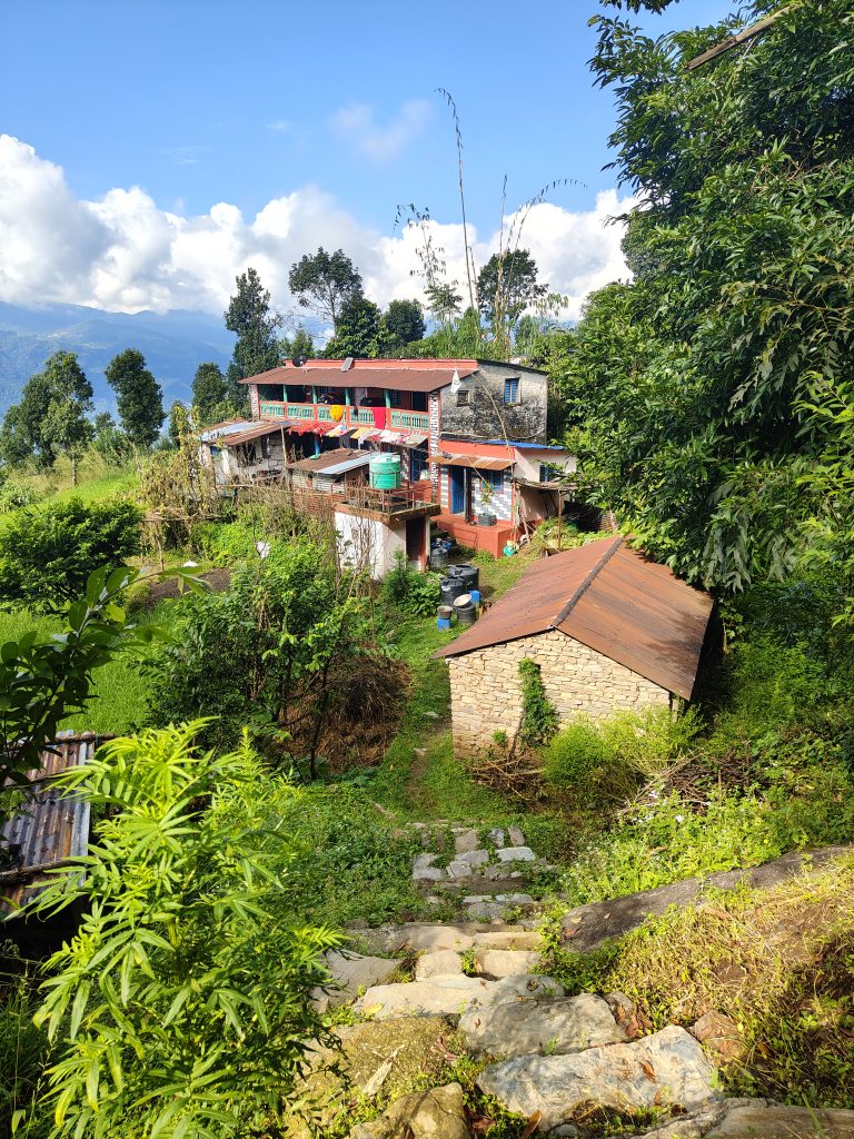 Alternative Text: A picturesque scene of a hillside village featuring a two-story building with a red roof, surrounded by lush greenery and tall trees.