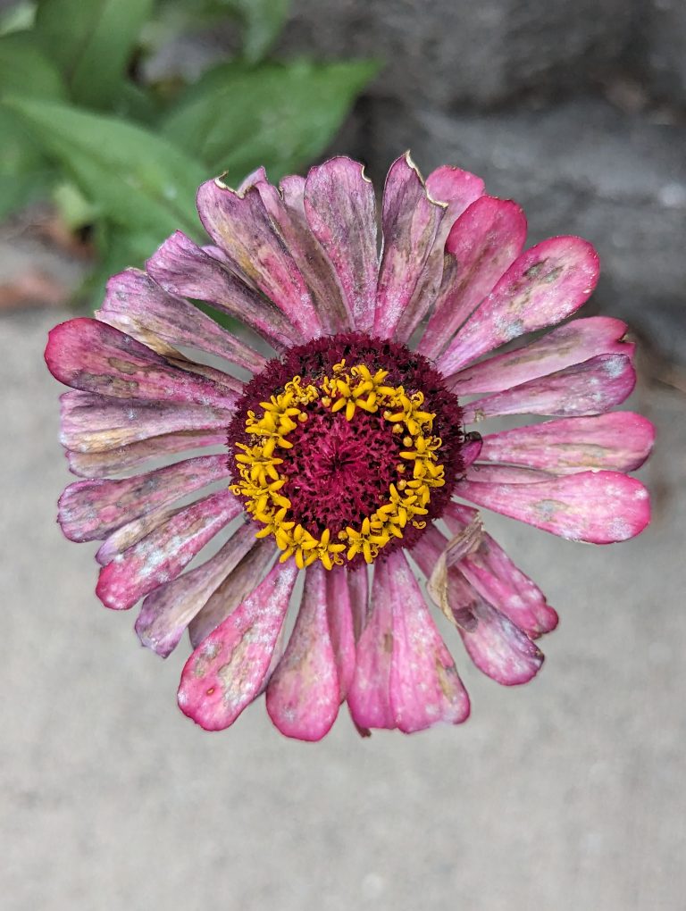 Alternative Text: Pink zinnia flower that is wilting in many colors and starting to disintegrate.