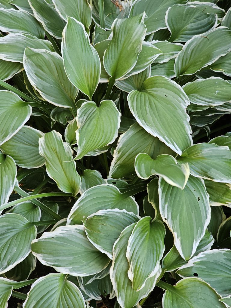 Alternative Text: Cluster of hosta leaves with white-edged borders, forming a dense green pattern. Captured at Pittock Mansion, Portland.