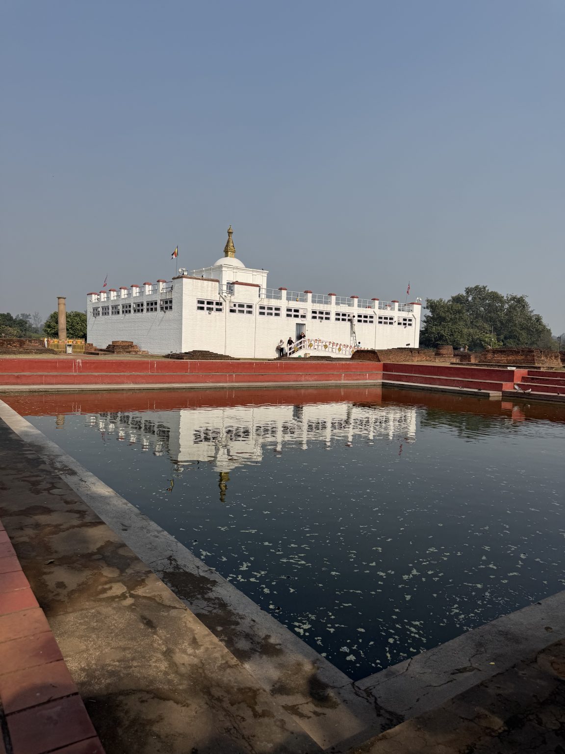 Alternative Text: A white building with a gold spire is visible in the background, reflecting in a calm body of water in the foreground.