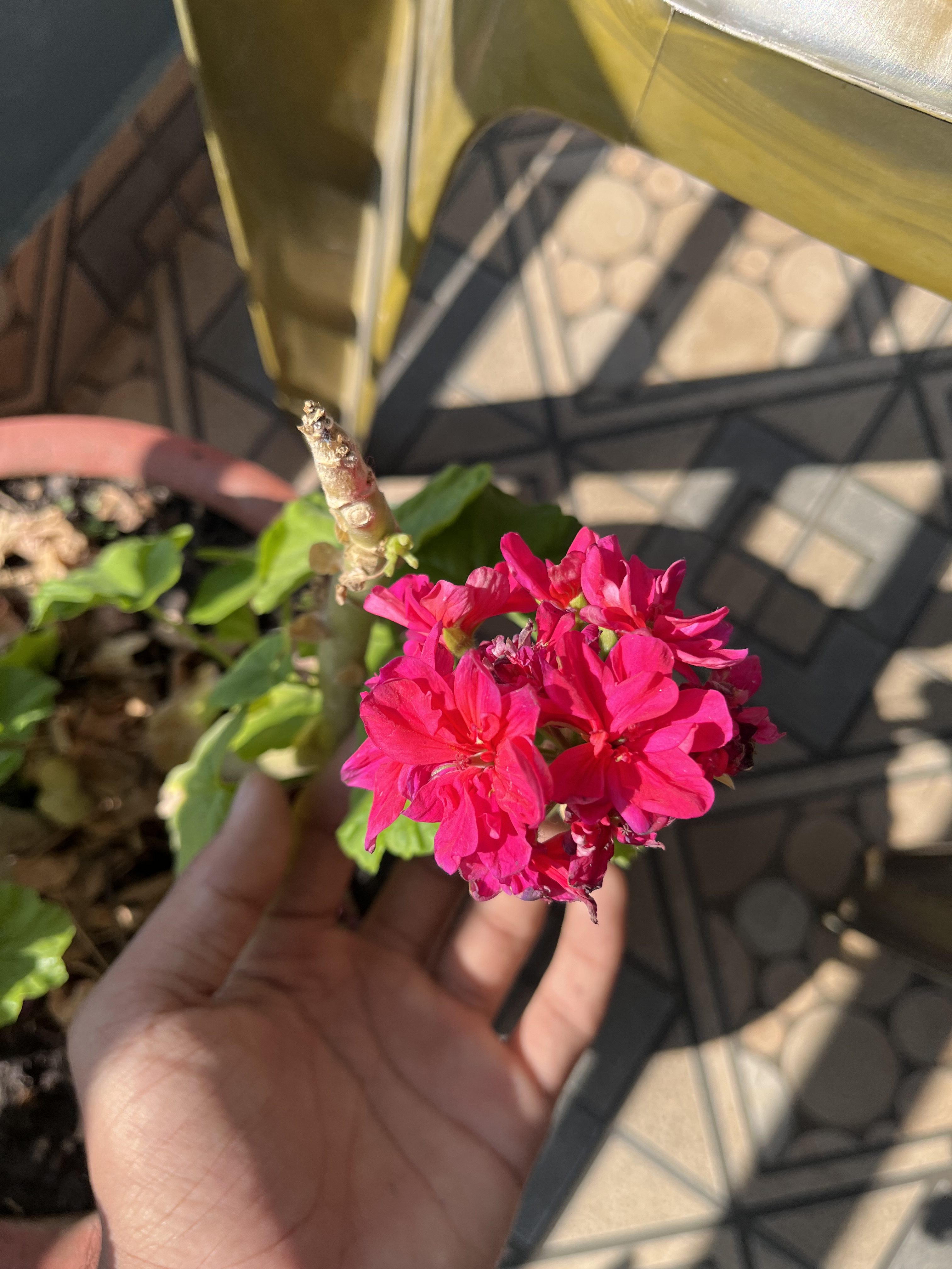 Alternative Text: A hand is holding a vibrant cluster of pink flowers, with deep green leaves in the background.