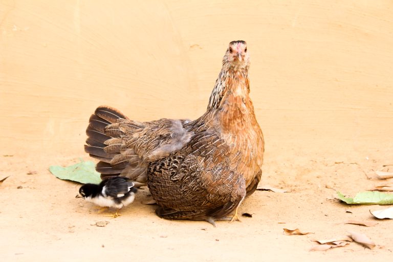 Alternative Text: A brown hen stands on the ground, facing the camera with a serious expression, while a small black and white chick pecks the ground nearby.