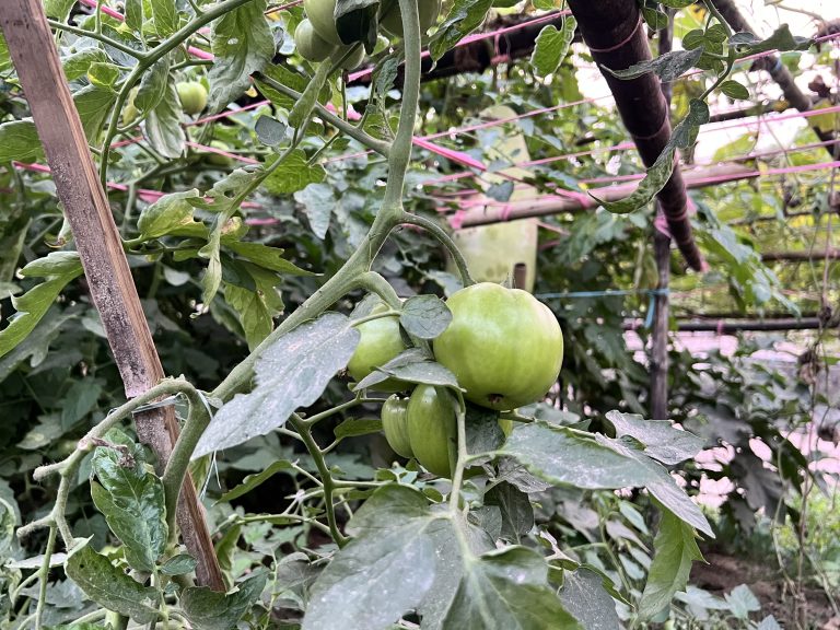 Alternative Text: Green tomatoes growing on a vine with a wooden trellis in a lush garden.