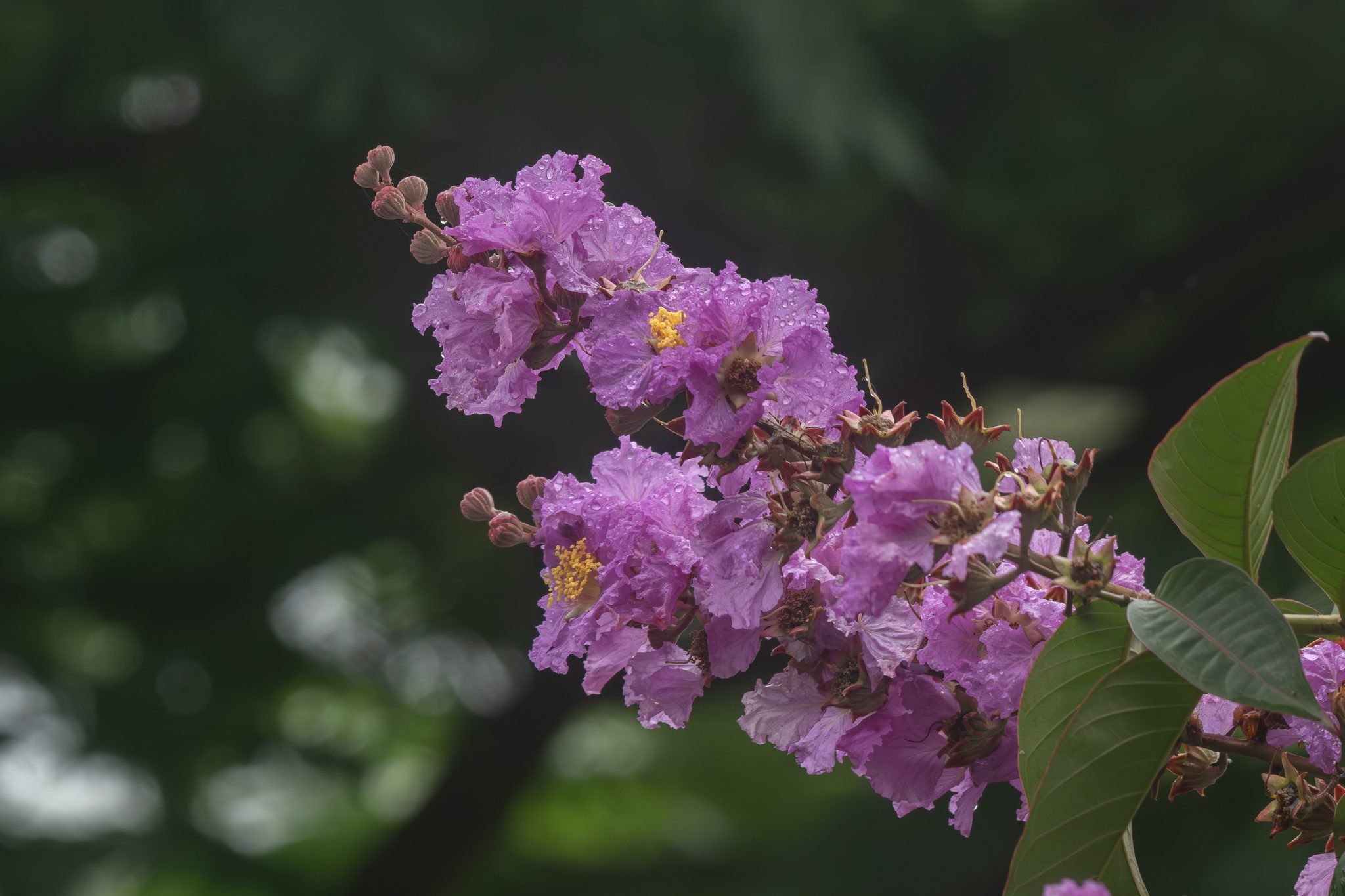 Alternative Text: A close-up of a branch with purple flowers, some with yellow centers, surrounded by green leaves and dewy droplets against a blurred background.