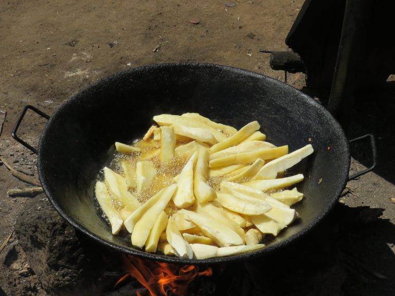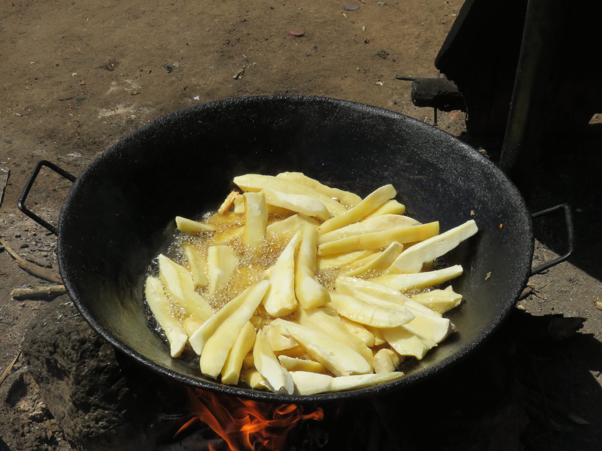 Alternative Text: Sliced cassava frying in a cast-iron wok over an open wood fire, with visible flames and a rustic outdoor cooking setup on dusty ground in Uganda.