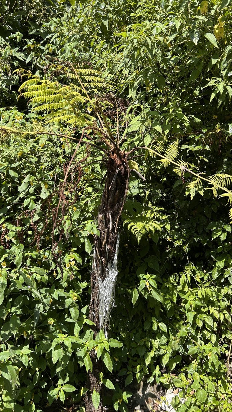 Alternative Text: A slender tree trunk with twisted roots rises amid lush foliage, topped with bright green fern leaves.