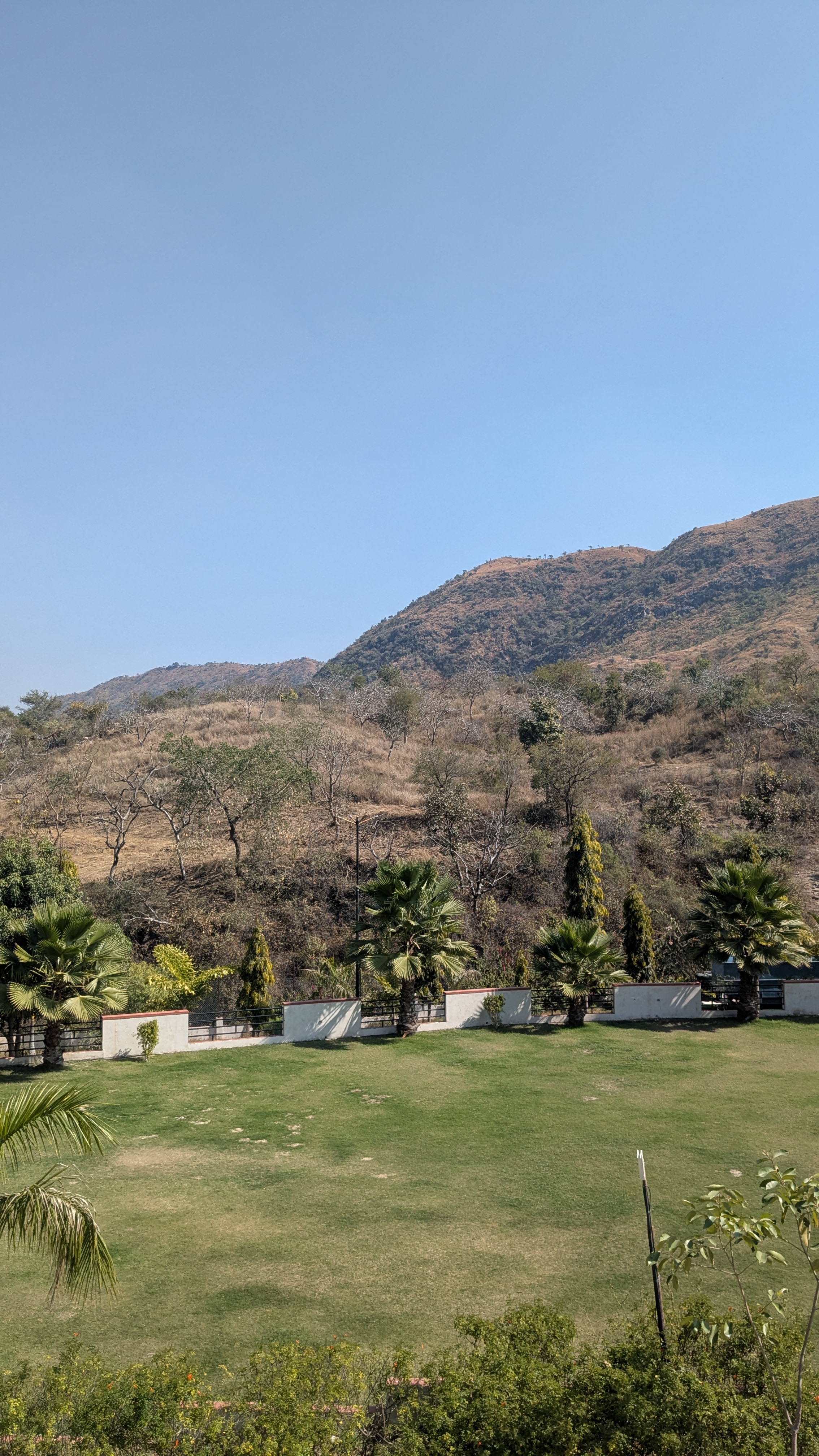 Alternative Text: A view of a grassy landscape with several palm trees in the foreground.