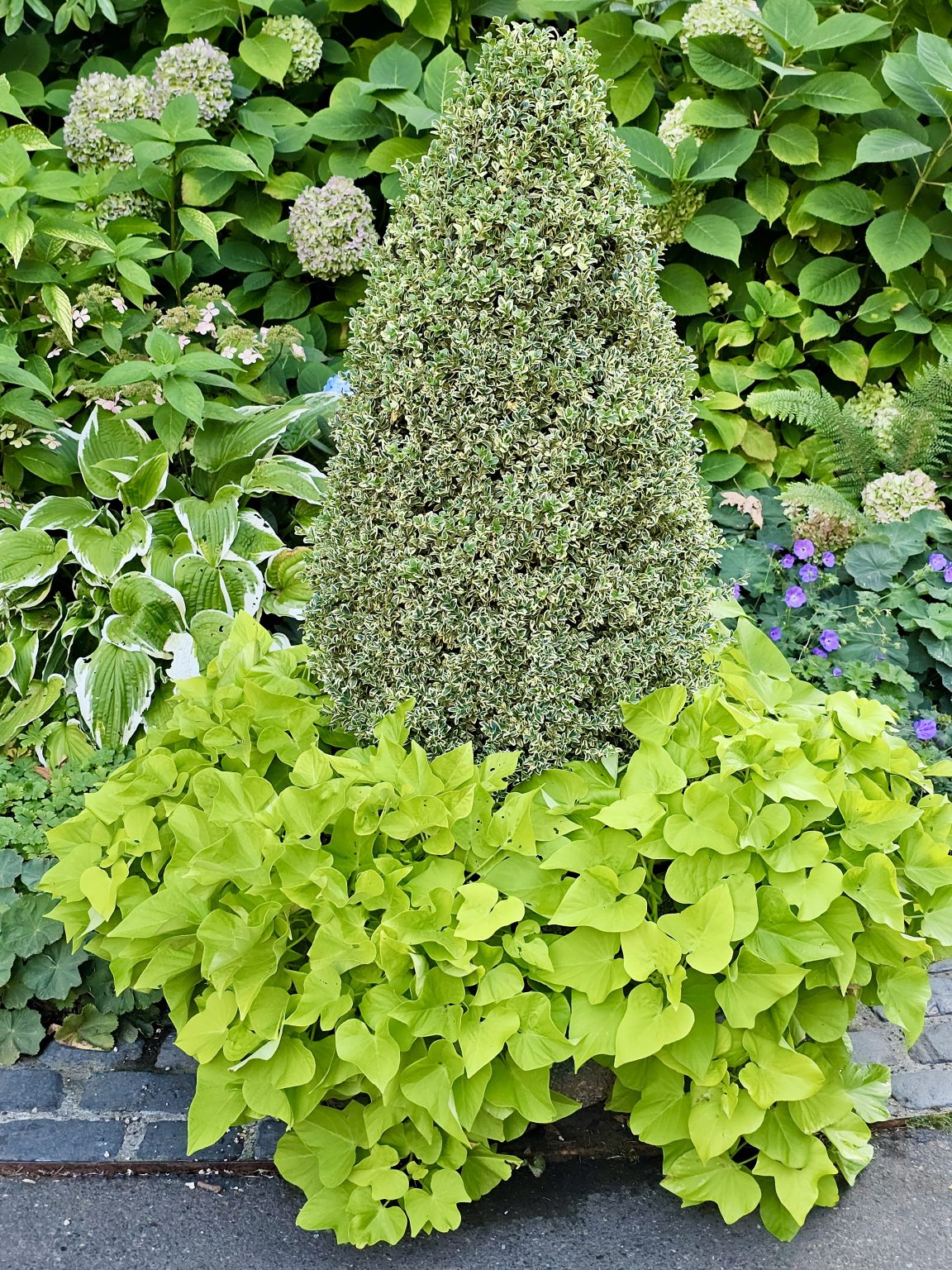 Alternative Text: A neat cone-shaped shrub surrounded by vibrant light green sweet potato vine. Captured in the evening at Pittock Mansion, Portland.