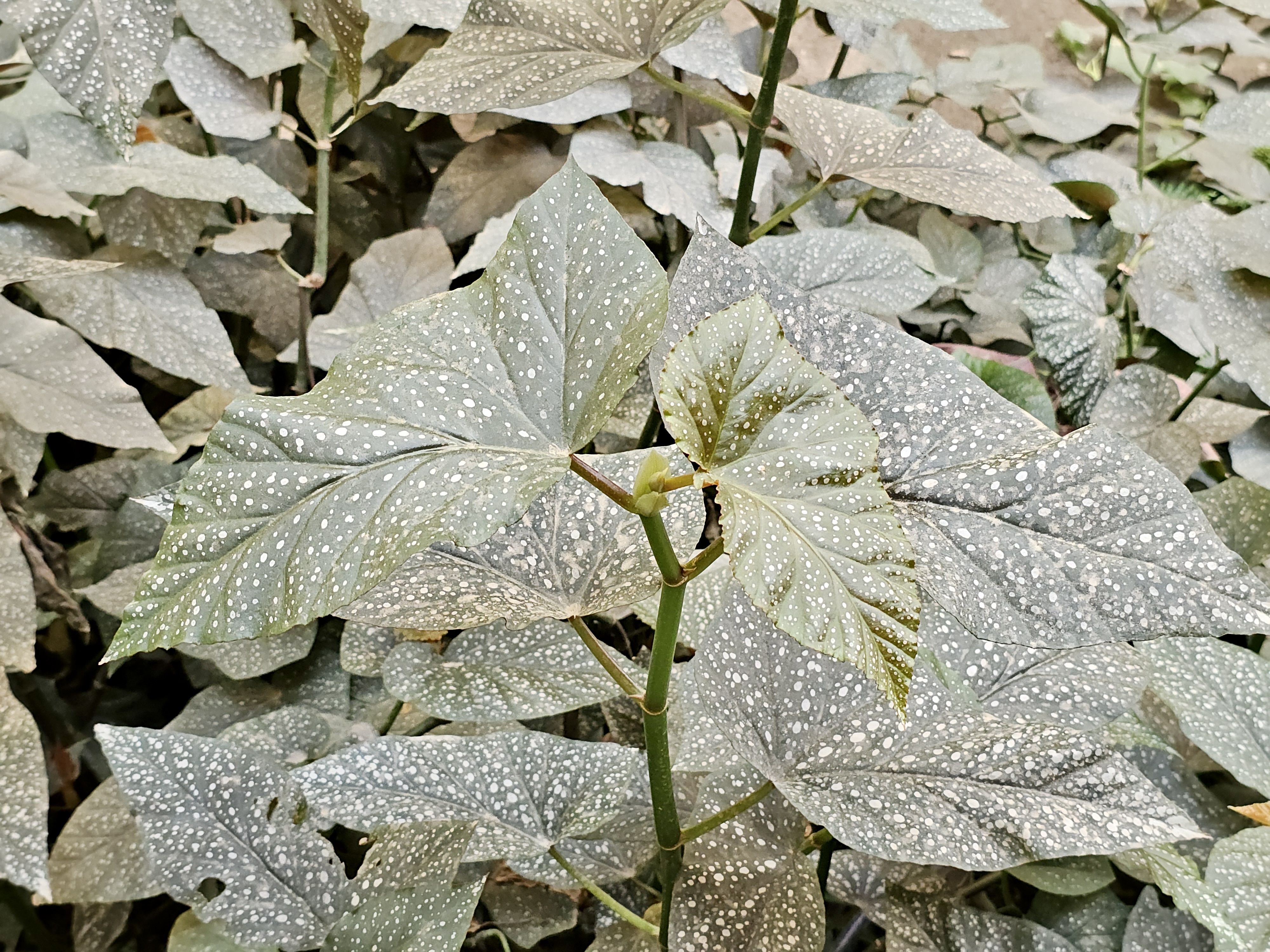 Alternative Text: A close-up of an Angel Wing Begonia (Begonia maculata), showing its large green leaves with bold white spots and red undersides, captured in soft natural light. Taken from the Oregon Zoo, Portland.