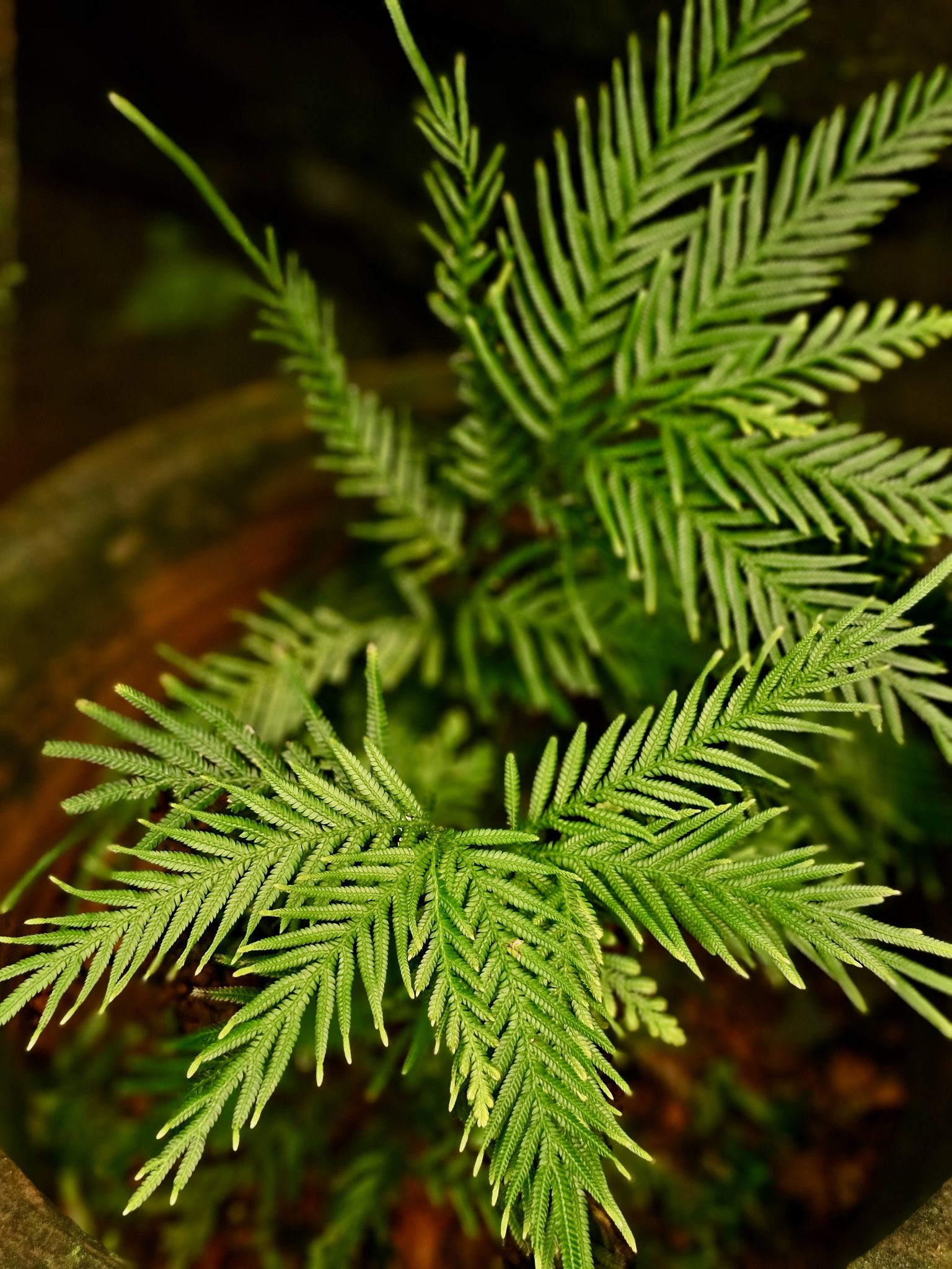 Alternative Text: A vibrant, close-up photo of a green plant with delicate, feathery leaves, possibly a Dawn Redwood or Bald Cypress seedling. The plant is in a pot with a dark, blurred background.