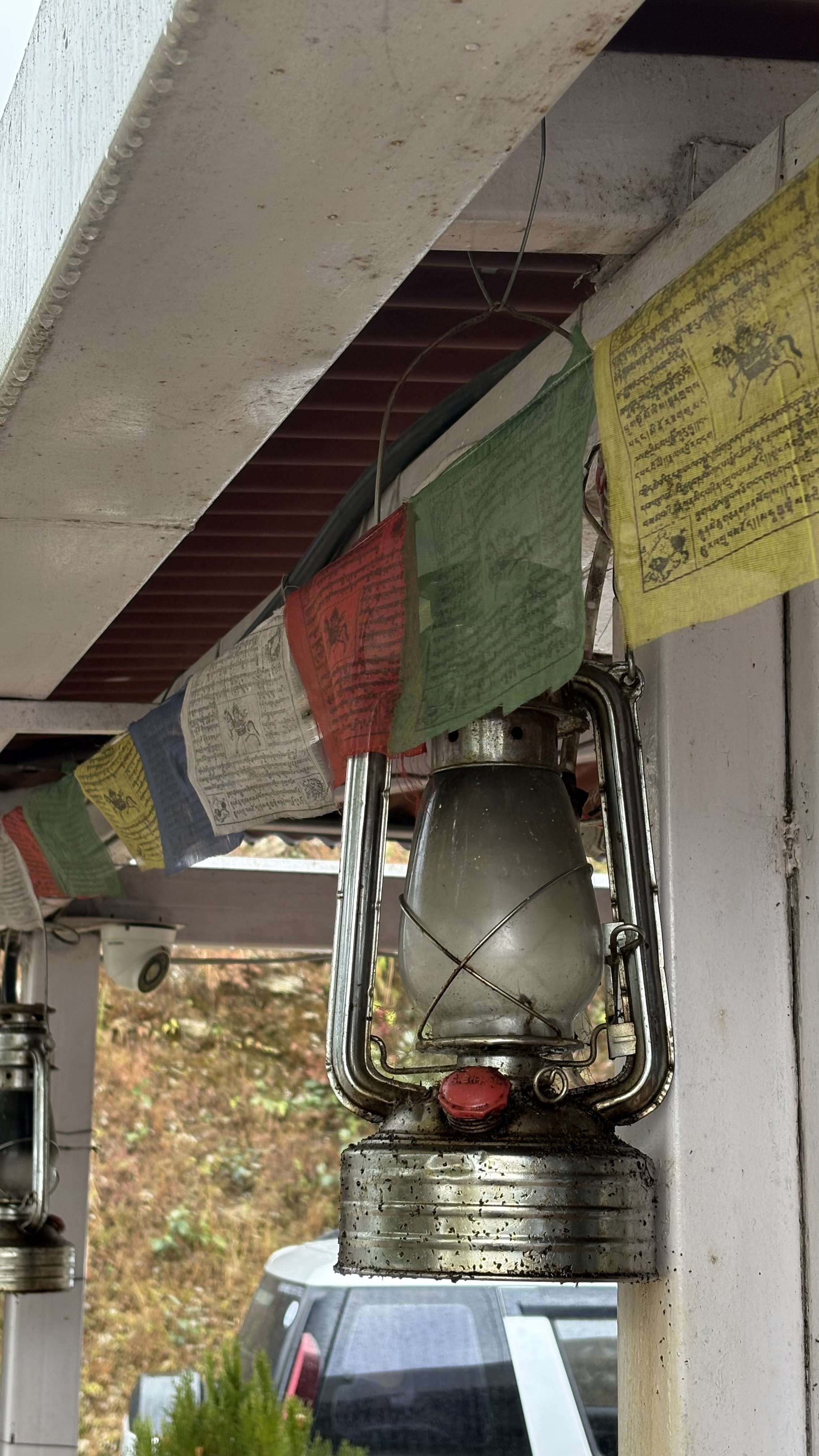 Alternative Text: A traditional lantern hangs from a roof, partially obscured by colorful prayer flags in red, blue, green, and yellow.