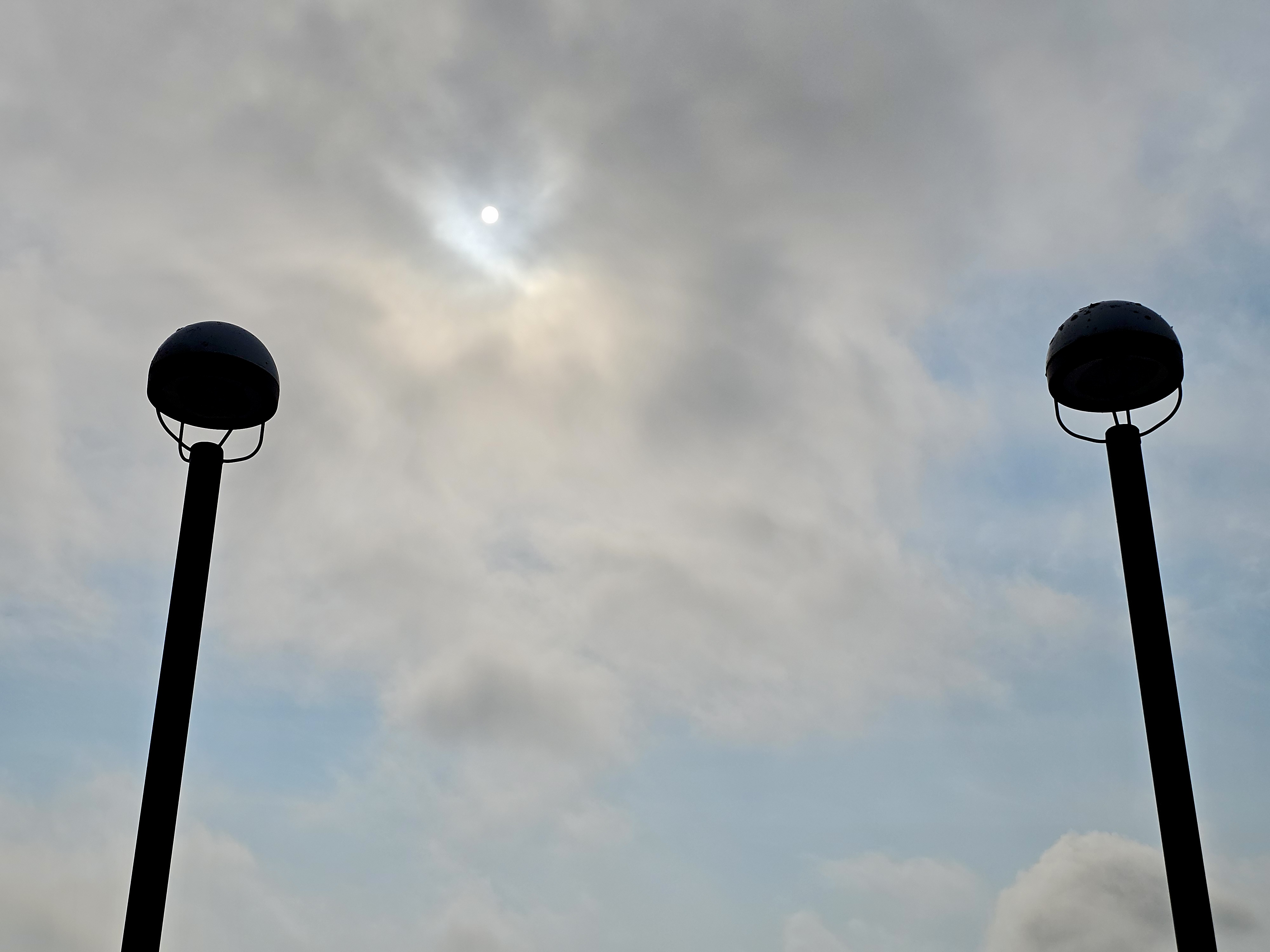 Alternative Text: Two lampposts stand against a bright, cloudy sky with the sun partially obscured, creating a serene and minimalist scene. Captured from World Forestry Centre, Washington Park, Portland.