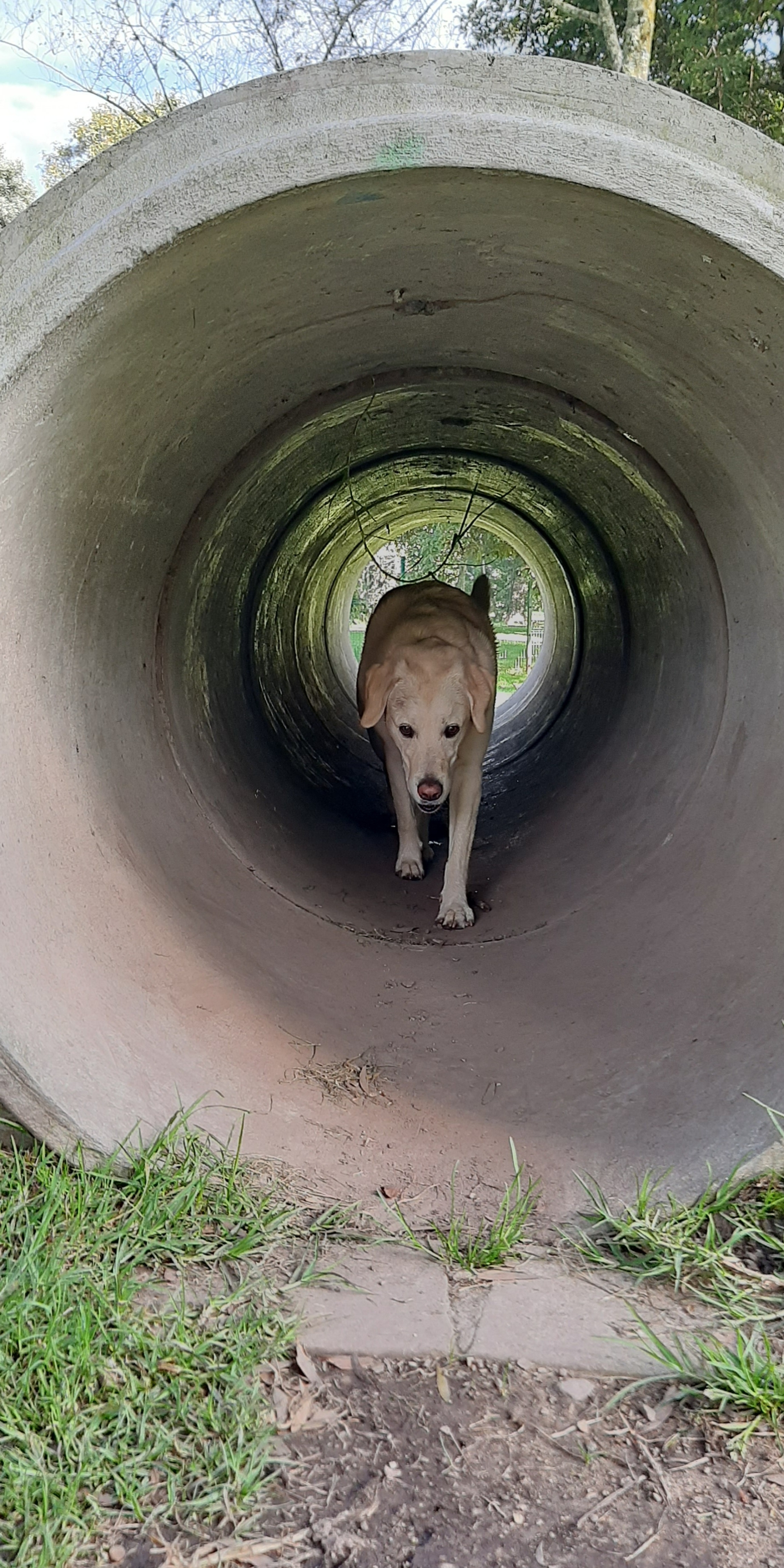 Alternative Text: Cream-colored Labrador dog walking inside a concrete tunnel at Simón Bolívar Park, Bogotá.
