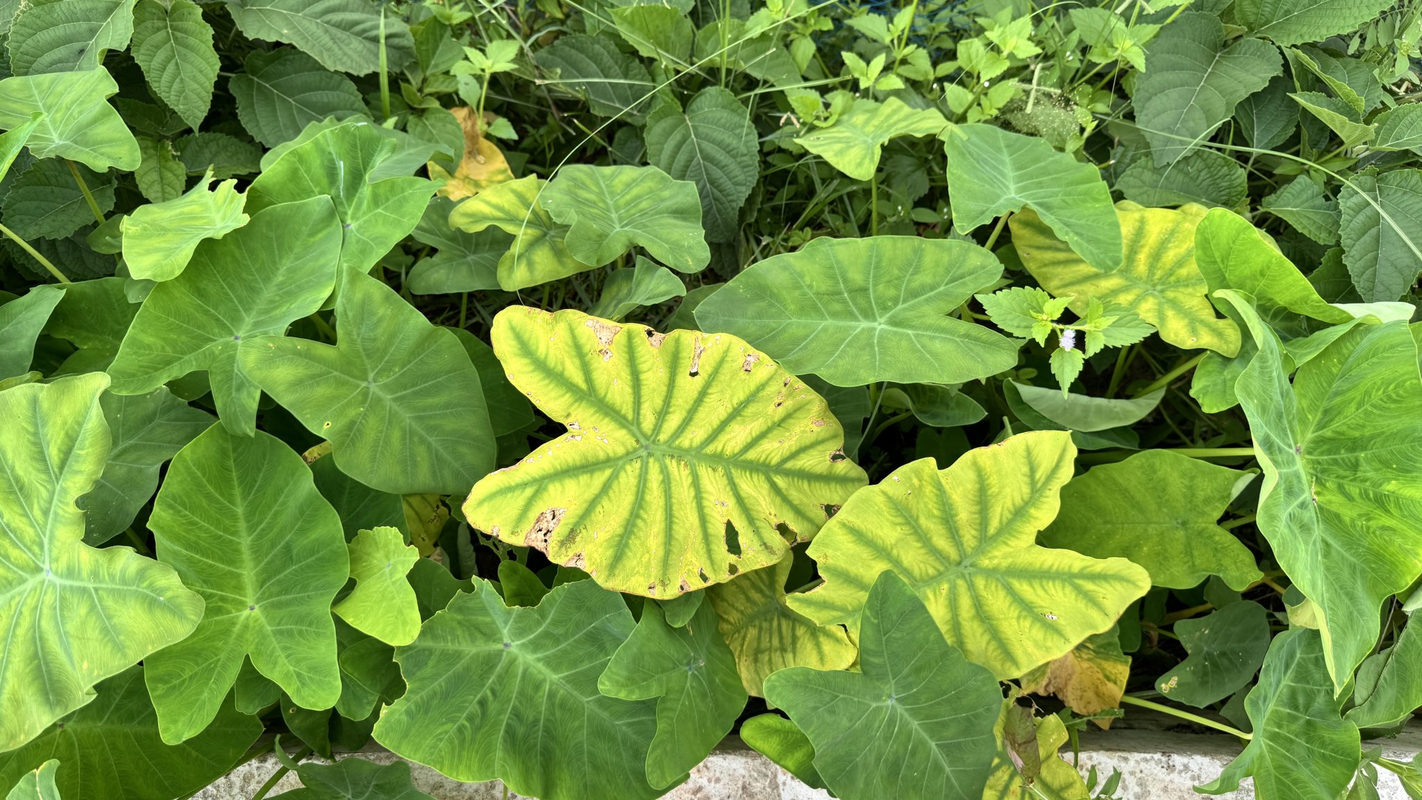 Alternative Text: A dense cluster of various green leaves, showcasing a mix of shapes and sizes, with some leaves displaying yellowing and spots.