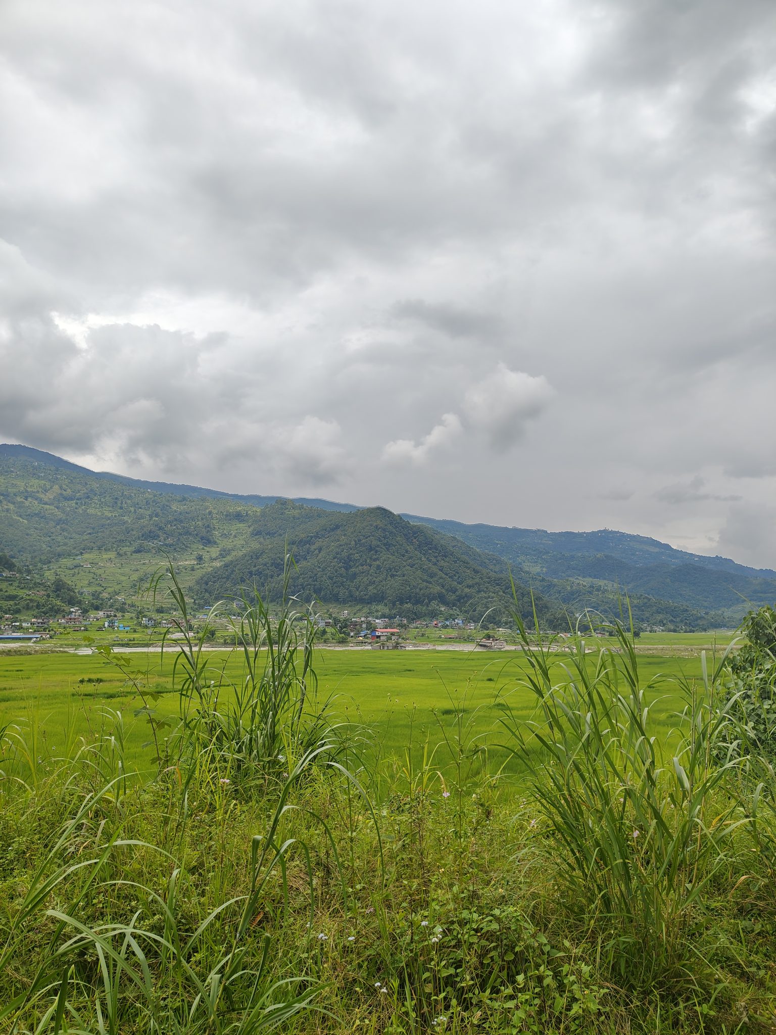 Alternative Text: A panoramic view of a lush green landscape featuring tall grasses in the foreground, rolling hills in the background, and an overcast sky filled with gray clouds.