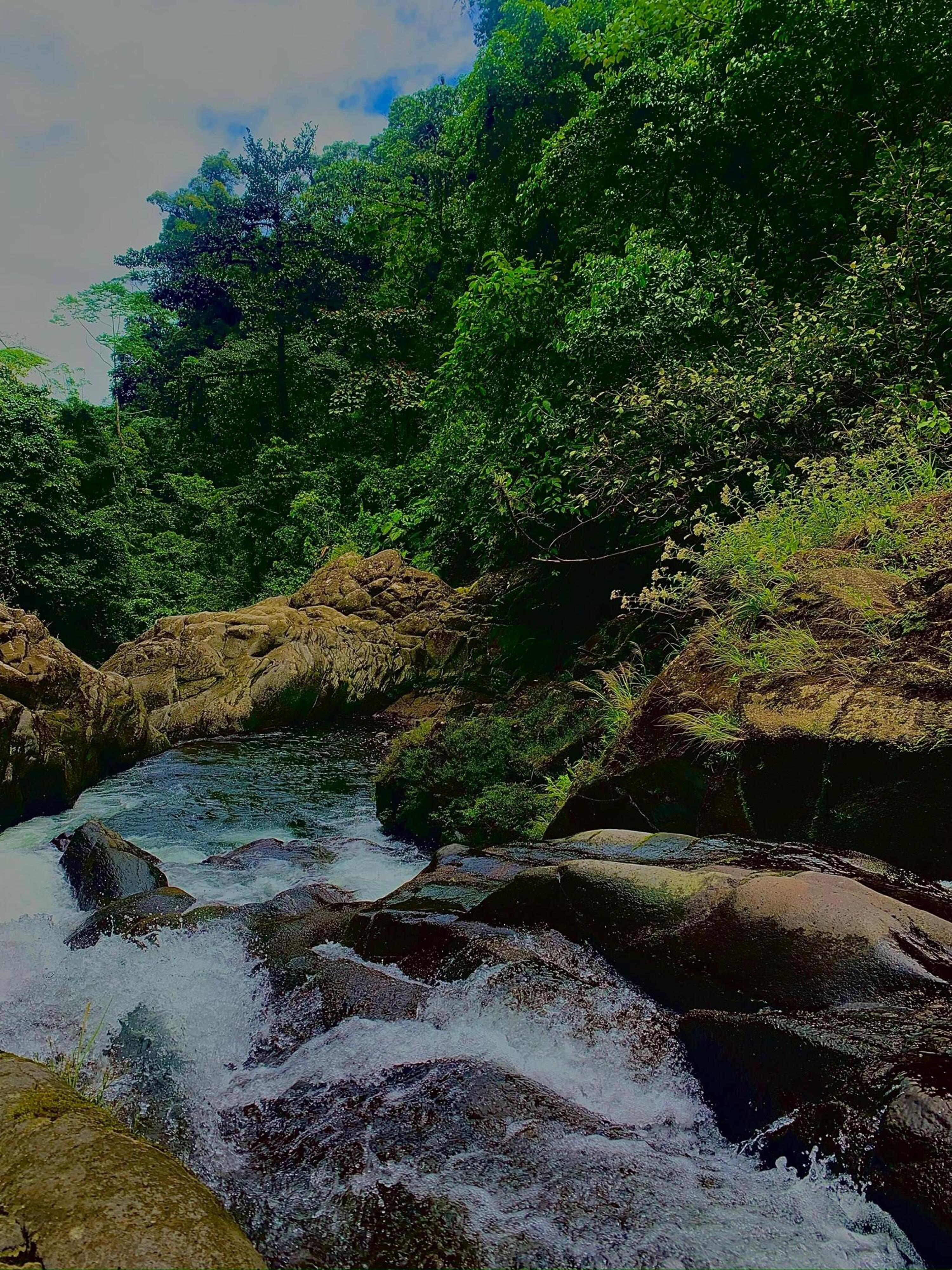 Alternative Text: Lush forest with tall moss-covered trees and rich green vegetation growing beneath them