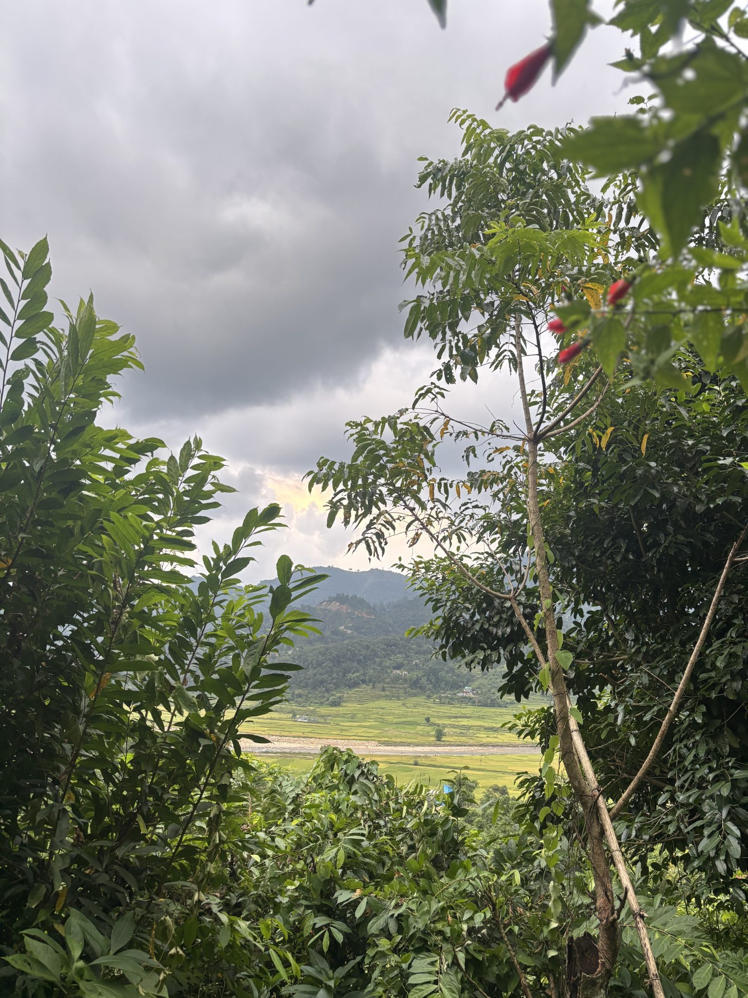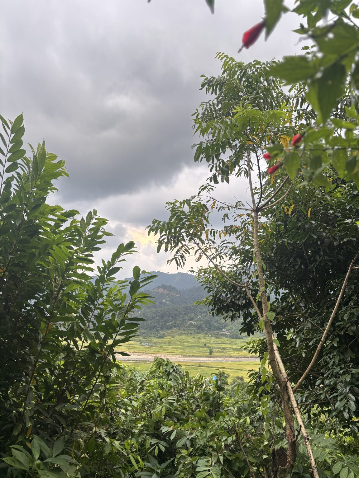 Alternative Text: A lush green landscape framed by foliage, featuring a mix of trees and plants.