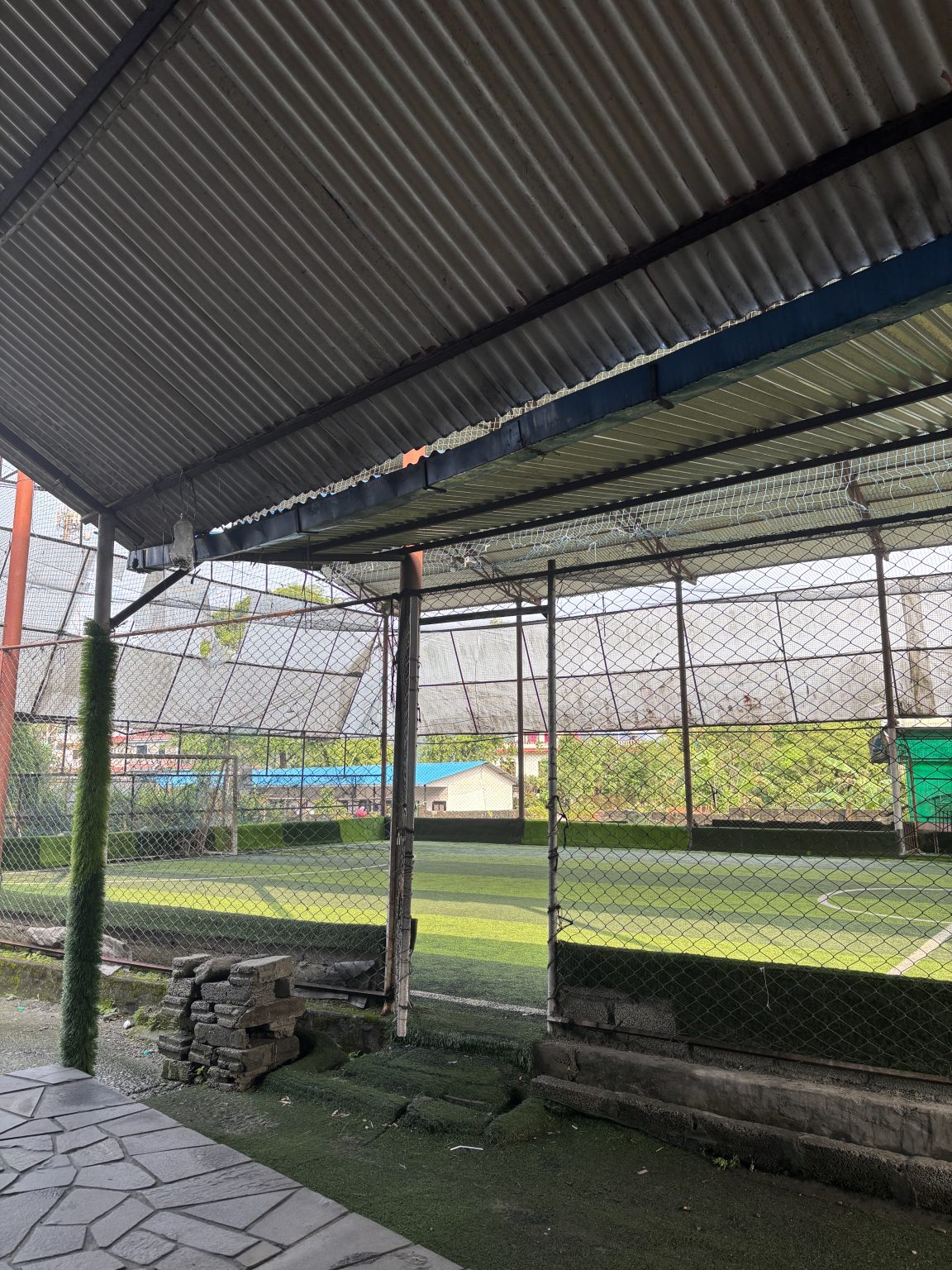 Alternative Text: The image shows the interior of a sports facility, specifically a fenced area that appears to be a small soccer fiel
