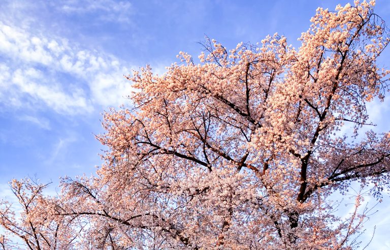 Alternative Text: A close-up view of a cherry blossom tree in full bloom, showcasing clusters of delicate pink flowers against a bright blue sky with scattered cloud