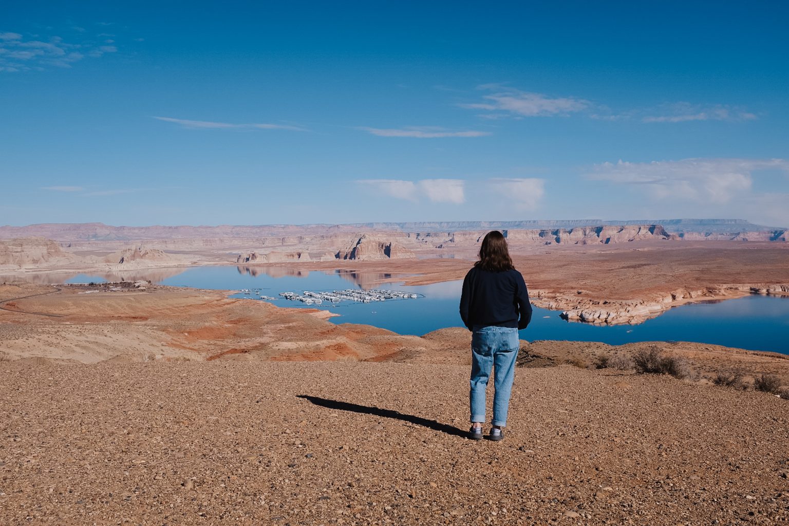 Alternative Text: Person standing at a viewpoint, looking out over Lake Powell and the reflection from the rocky formations alongside the lake.