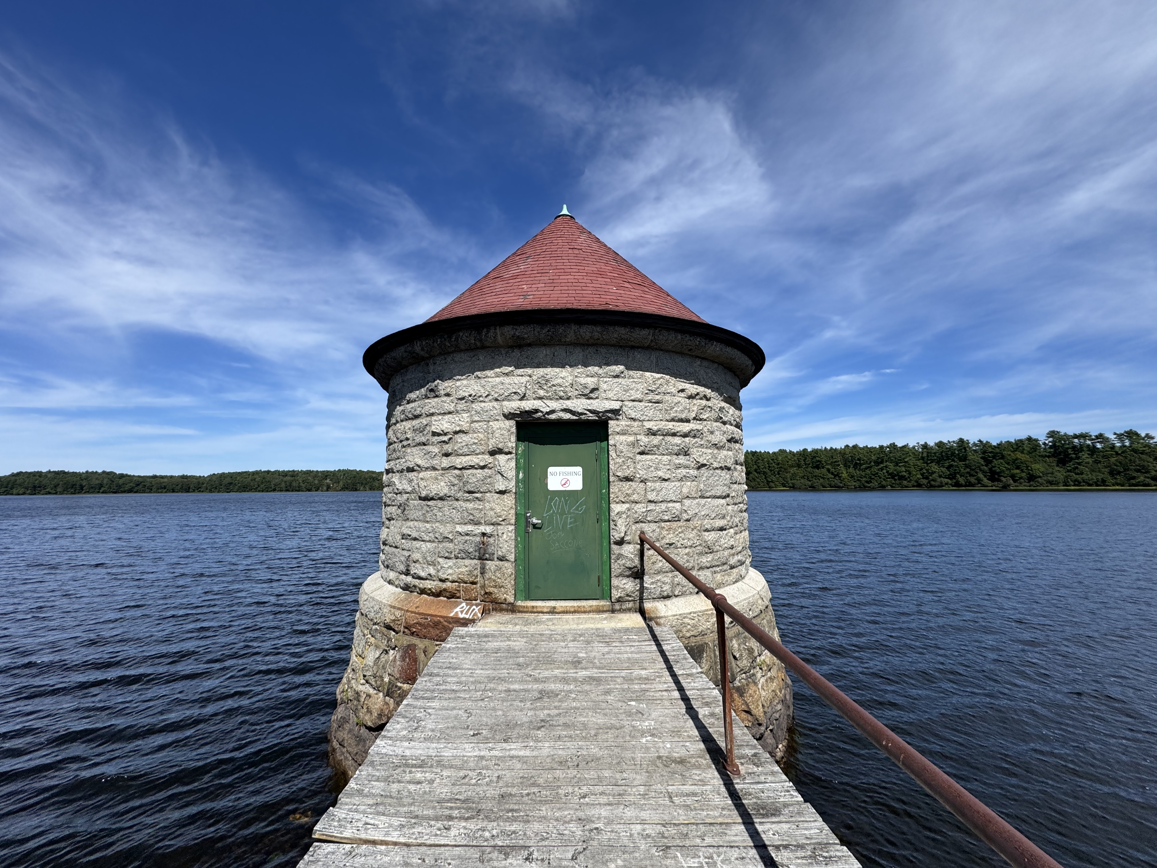 Alternative Text: Round stone water tower with a red roof at the end of a wooden walkway over a reservoir.
