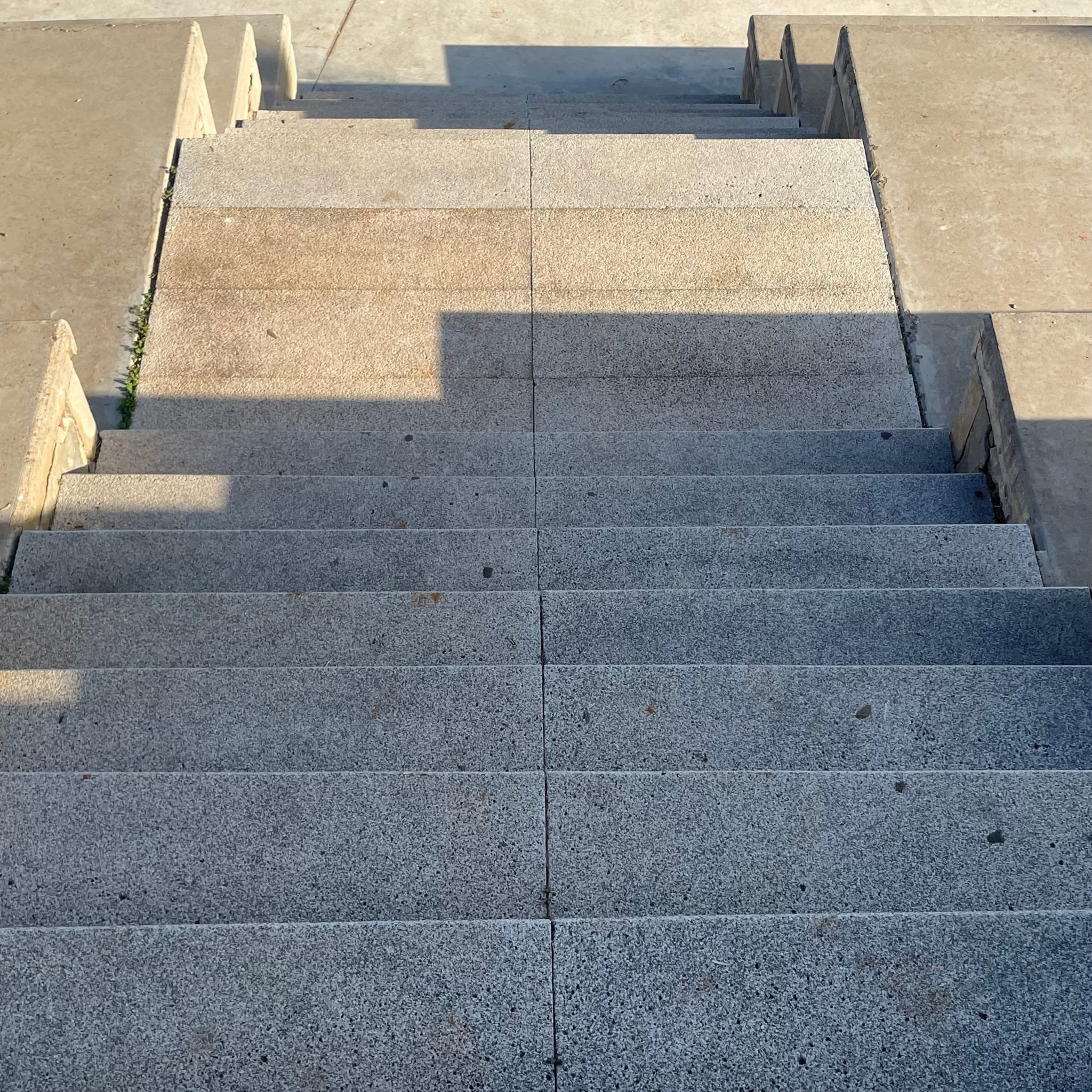 Alternative Text: A gray concrete stair tread with a simple, rustic design. The steps have slightly irregular edges, reflecting a less polished finish. The concrete shows natural textures and subtle variations in color, highlighting its robust and functional character.