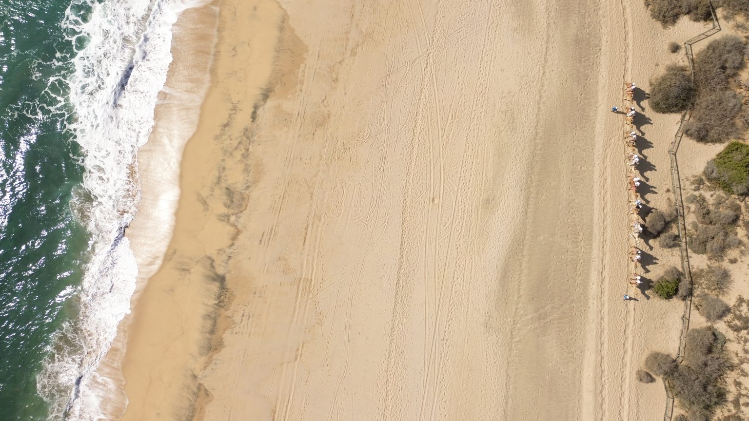 Alternative Text: An aerial view capturing the serene calm sea meeting the sandy shore, where a small group of camels gracefully walk along the coastline. The peaceful blend of ocean and desert creates a unique and captivating scene from above.