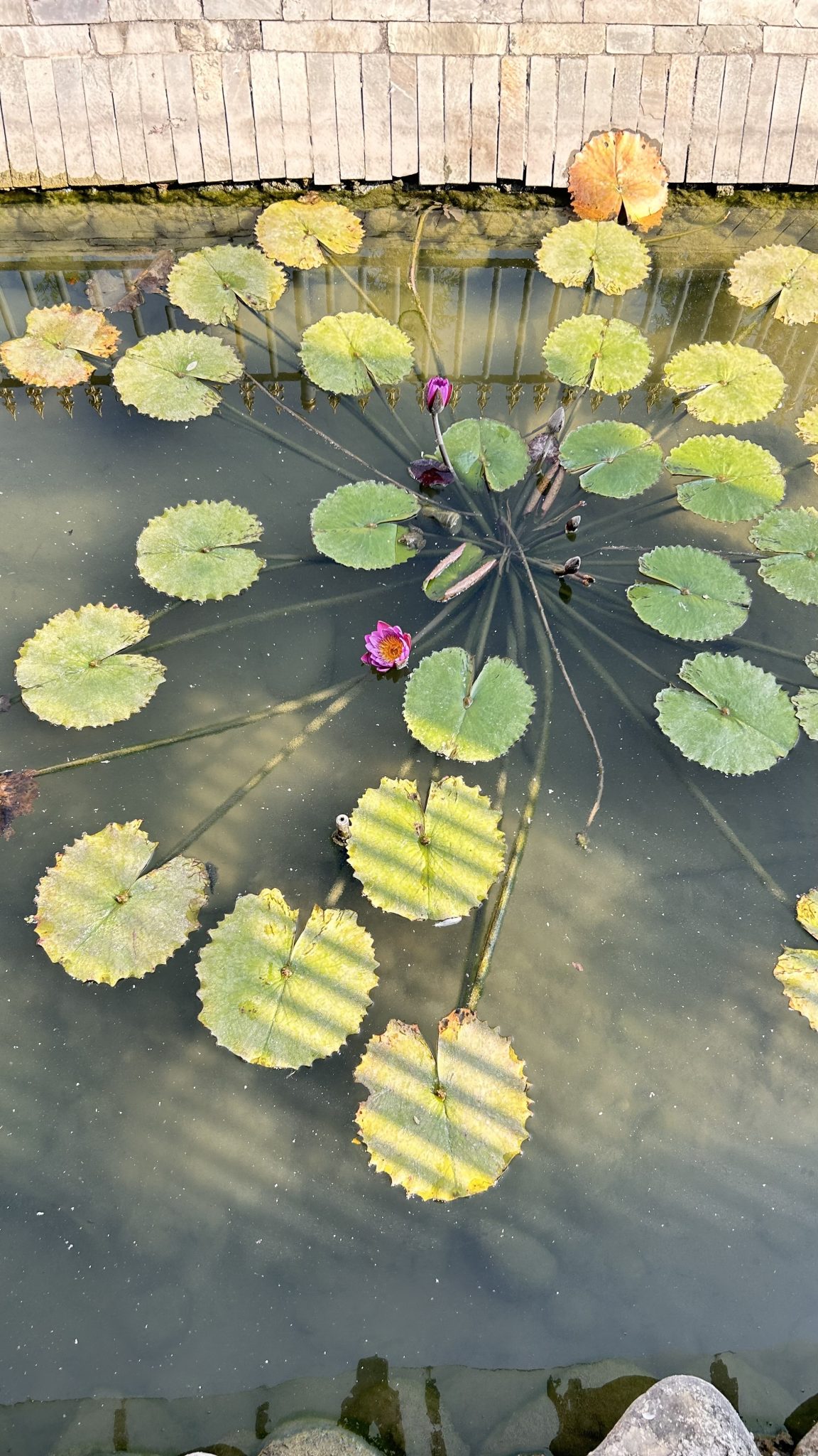 Alternative Text: A serene water scene featuring lily pads and a pink water lily in bloom.